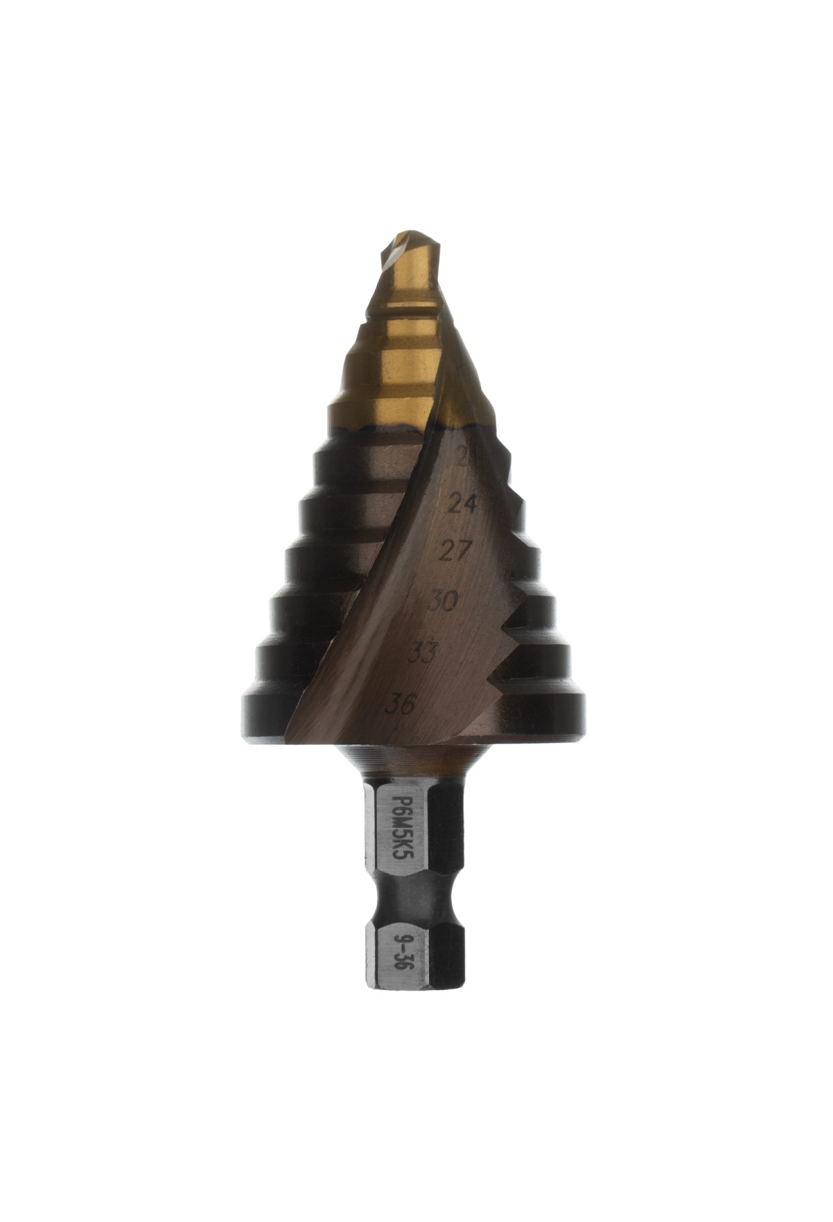 Технические характеристики Сверло ступенчатое, 9-12-15-18-21-24-27-30-33-36 мм, Р6М5К5, 6-гр. хвостовик Denzel