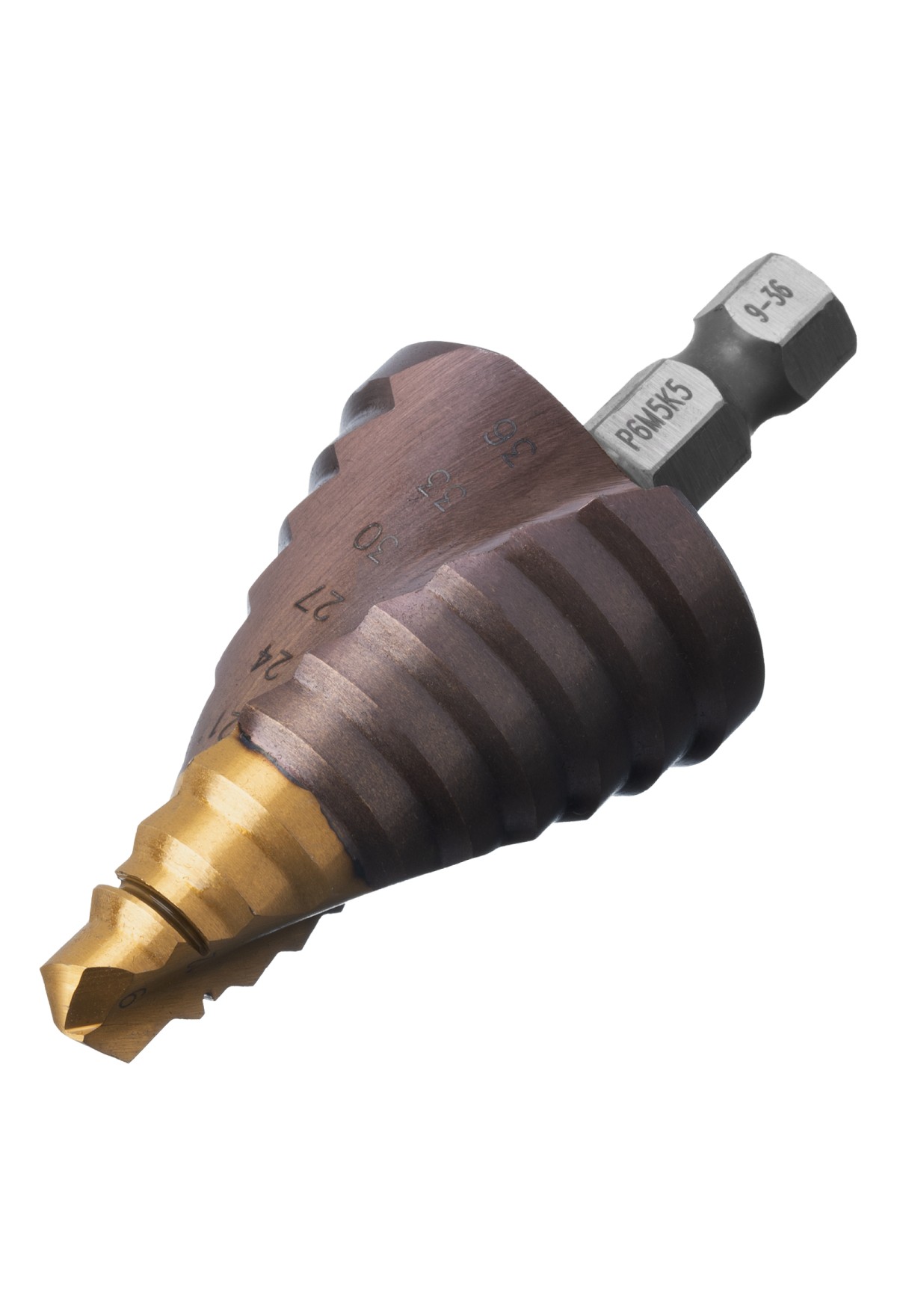 • Сверло ступенчатое, 9-12-15-18-21-24-27-30-33-36 мм, Р6М5К5, 6-гр. хвостовик Denzel