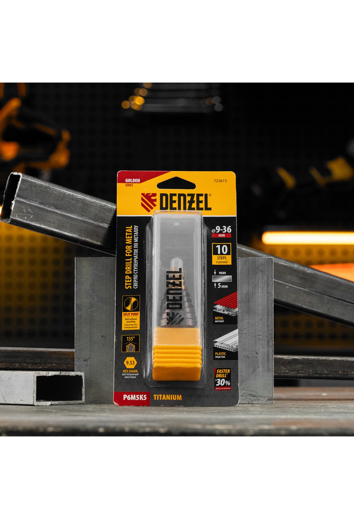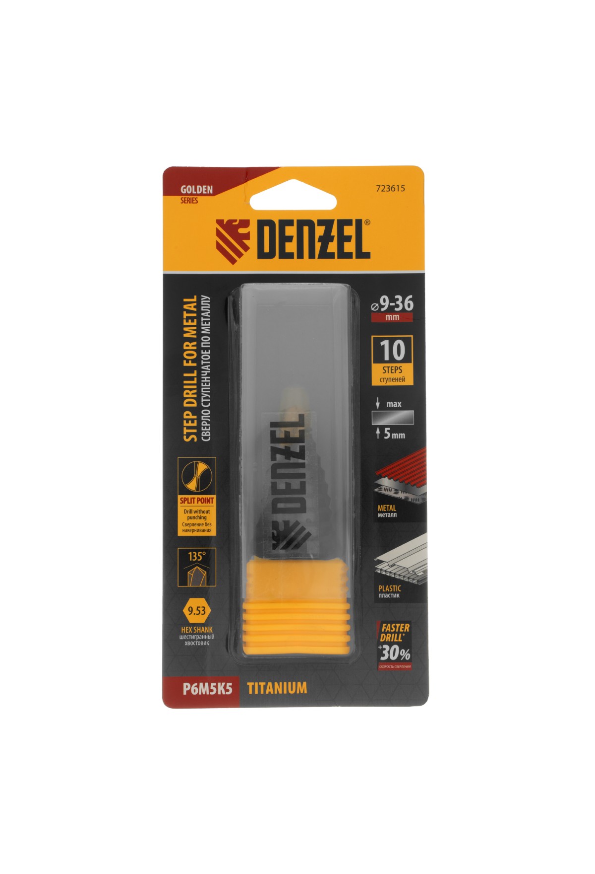 Ступенчатое сверло Denzel 723615 из стали P6M5K5, с 6-гранным хвостовиком, предназначено для сверления отверстий диаметром от 9 до 36 мм в сталях, цветных металлах и пластике. Избавляет от необходимости иметь при себе целый набор традиционных сверл. Позволяет получать отверстия с ровными краями и уже снятой фаской под гайку или болт. Оснастке присвоен класс точности A1. Сверло пригодится дома и в мастерской.