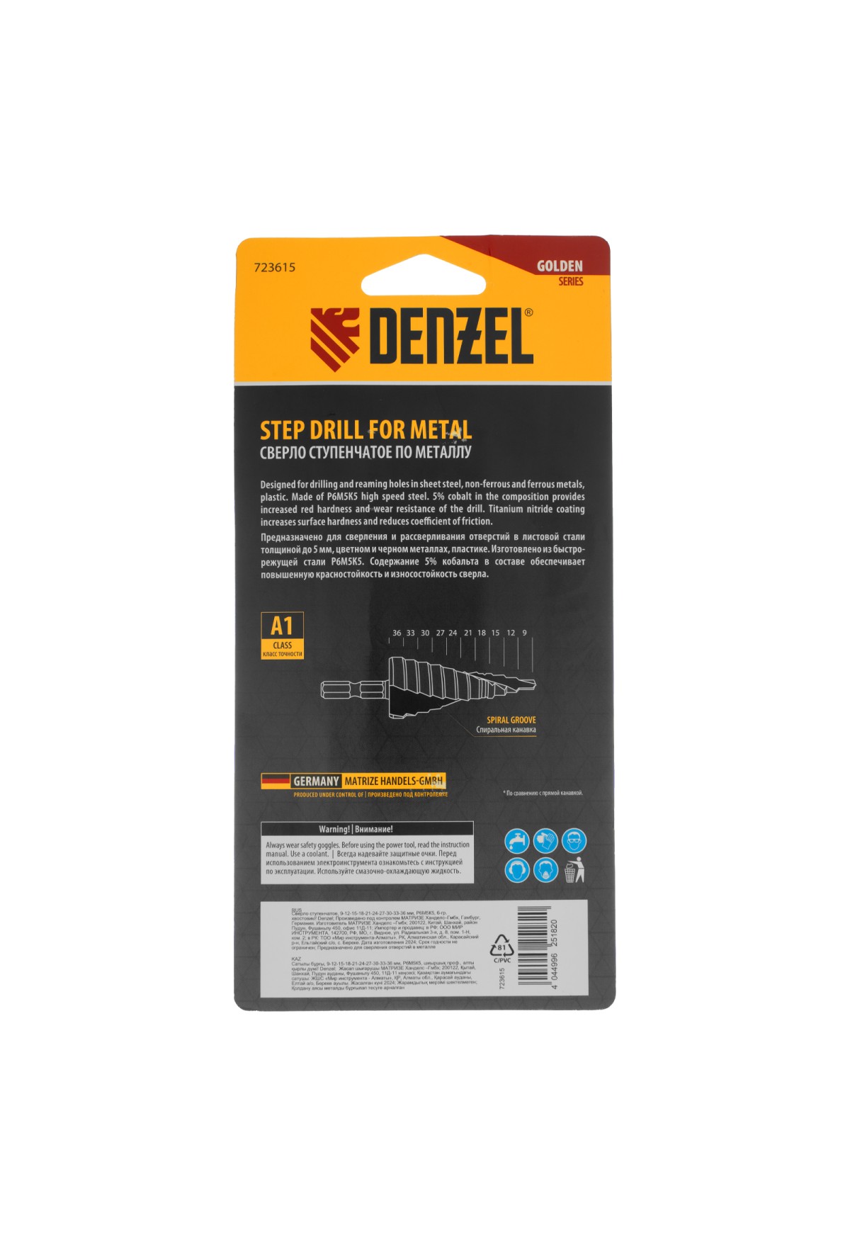 Тэги: Сверло ступенчатое, 9-12-15-18-21-24-27-30-33-36 мм, Р6М5К5, 6-гр. хвостовик Denzel, VR6-723615, DENZEL, VR6, VR6-Режущий инструмент, VR6-Сверла, VR6-Сверла по металлу