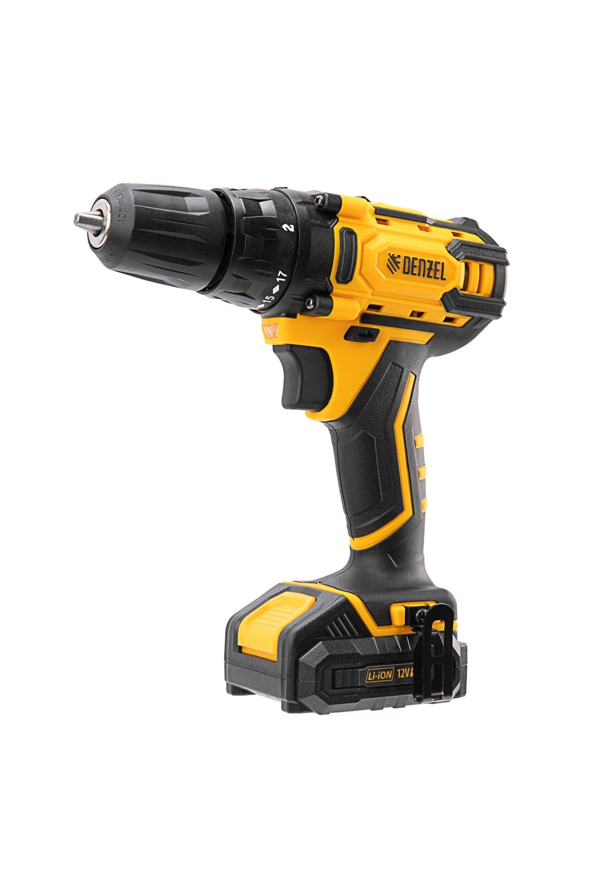 Аккумуляторная дрель-шуруповерт Denzel CDL-12-02BM 26105 с 2 батареями Li-Ion 12 В предназначена для монтажа и демонтажа резьбовых соединений, cверления отверстий в металле (до 10 мм), древесине (до 16 мм), пластмассе и других материалах. Инструмент пригодится профессионалам и любителям на строительной площадке, дома или на даче.,Надежные литий-ионные аккумуляторы без эффекта памяти и защитой от глубокого разряда обеспечивают долгий срок службы инструмента. Дрель не зависит от сети питания, что делает удобной работу на строительных объектах, на высоте и в отдаленных участках дома.