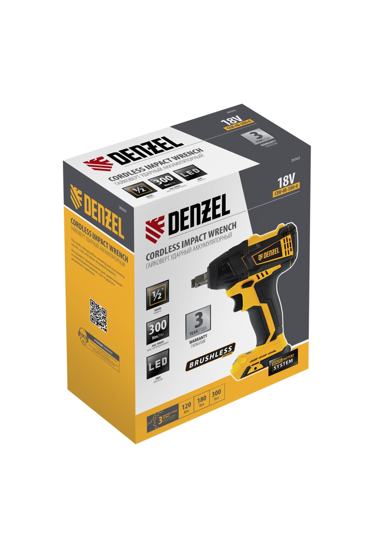 Ударный аккумуляторный гайковерт Denzel CIW-IB-300-0 26502 с бесщеточным двигателем, работающий от батареи Li-Ion 18 В (не входит в комплект поставки), развивает крутящий момент до 300 Нм. Предназначен для монтажа и демонтажа резьбовых соединений, легко справляется с перетянутым и закисшим крепежом.,Инструмент работает на единой платформе Denzel battery system и совместим с аккумуляторами 18 В. Гайковерт с присоединительным квадратом 1/2"будет полезен для сборки/разборки мебели и металлических конструкций, а также при техобслуживании автомобилей.