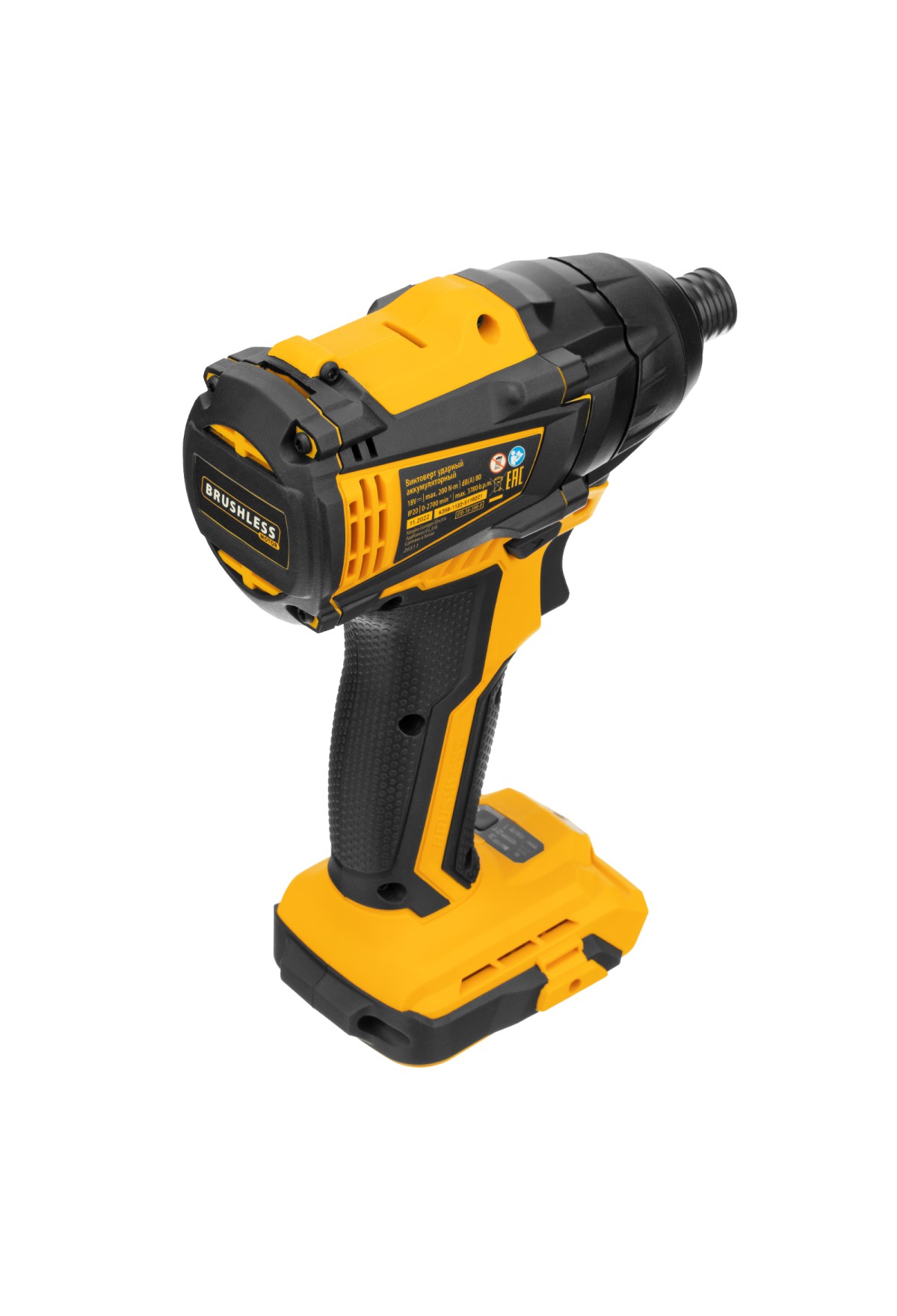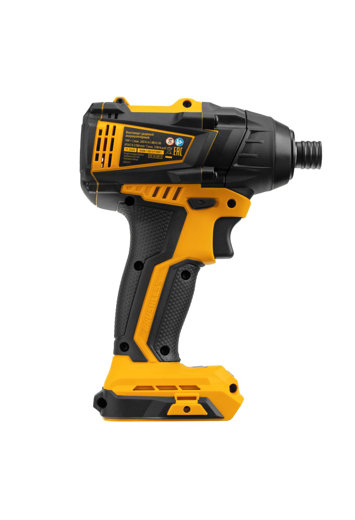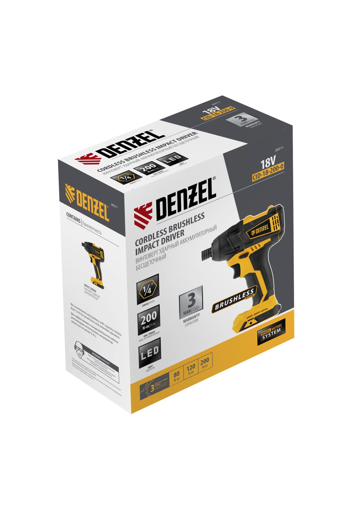 Ударный аккумуляторный винтоверт Denzel CID-IB-200-0 26511 с бесщеточным двигателем работает от аккумулятора Li-Ion с рабочим напряжением 18 В (не входит в комплект поставки) и благодаря высокому крутящему моменту 200 Нм подходит для завинчивания и отвинчивания винтов и шурупов, а также затягивания и откручивания гаек. Эффективен для демонтажа перетянутого и закисшего крепежа, закручивания длинных болтов и шурупов. Пригодится для сборки мебели и различных конструкций.,Аккумуляторный винтоверт не зависит от стационарного источника энергии. Инструмент работает на платформе 18V Denzel battery system и совместим с элементами питания 18 В.