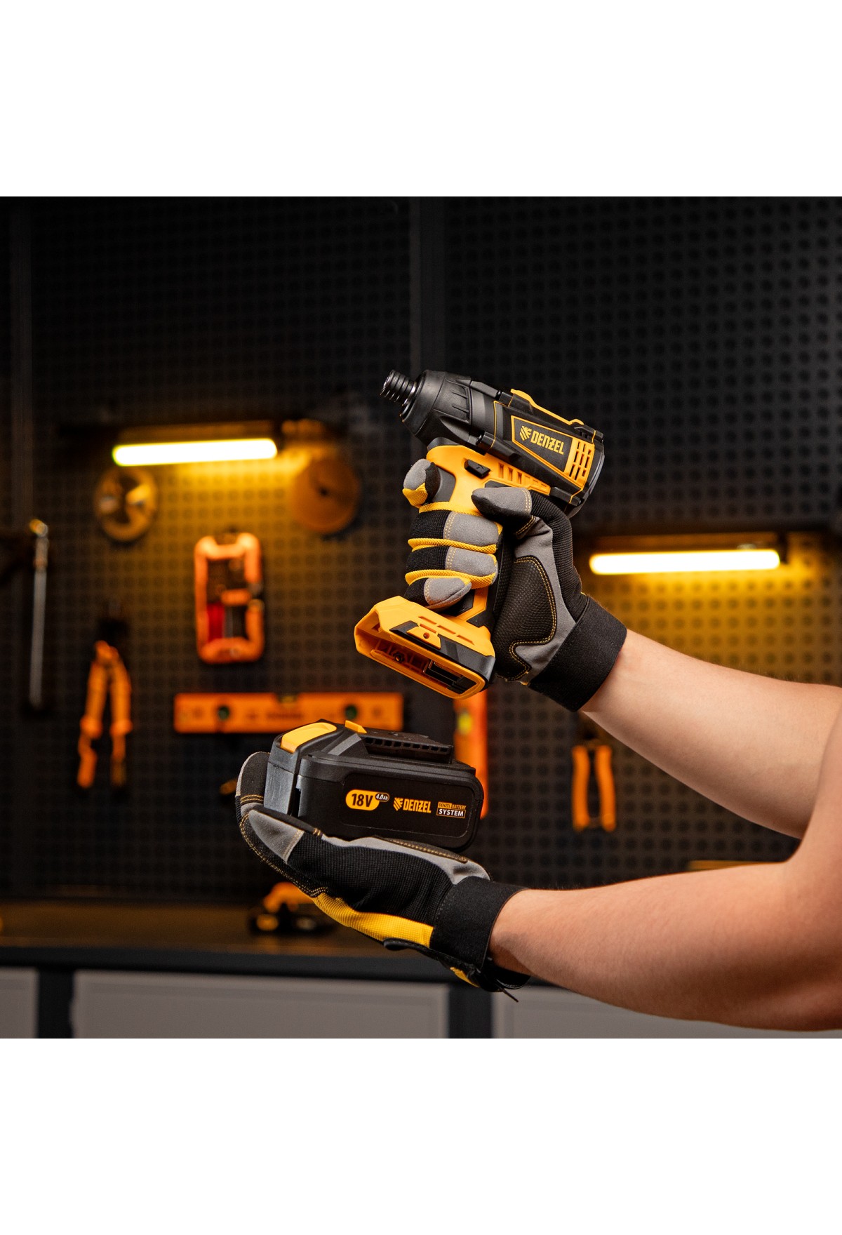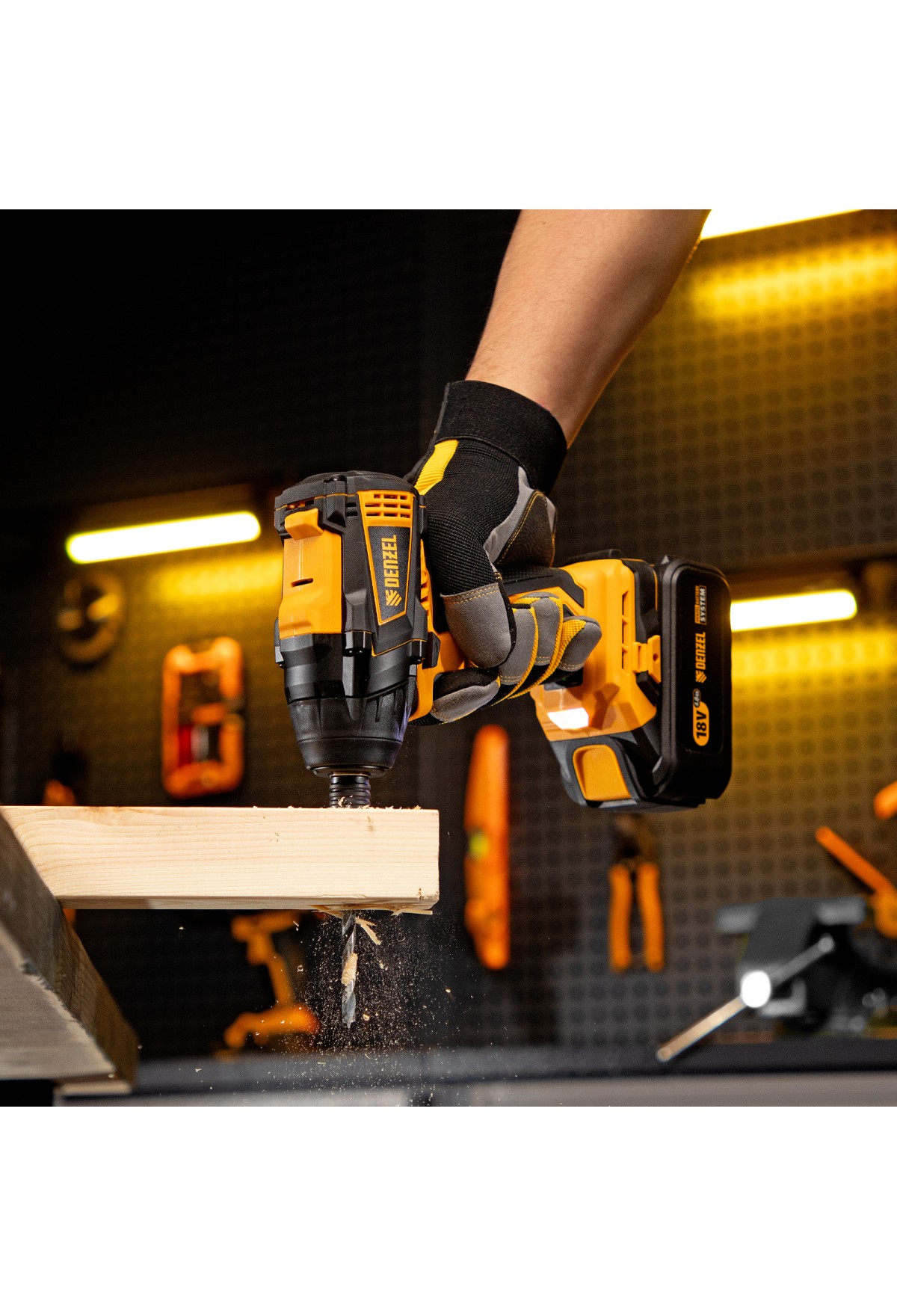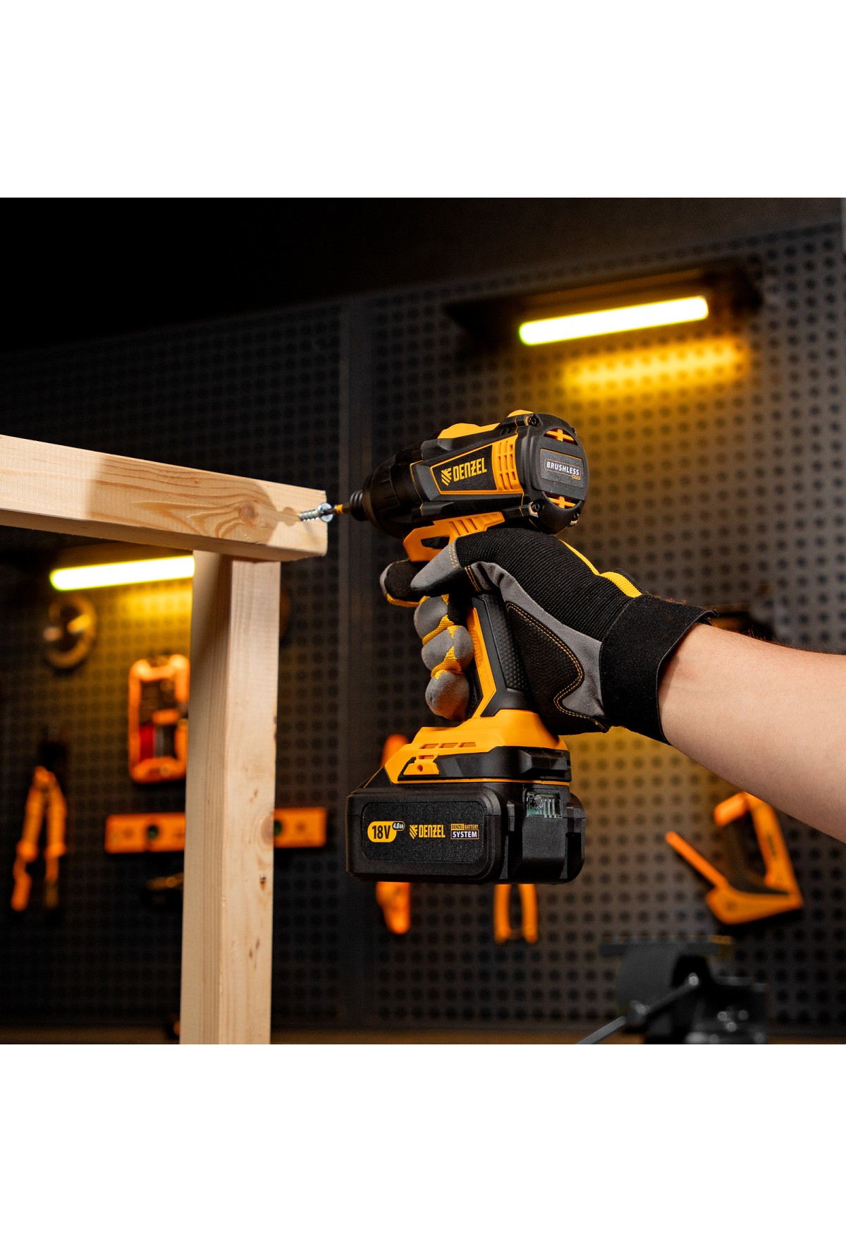 - Универсальность — к инструменту подойдут любые 18 В аккумуляторы Denzel battery system