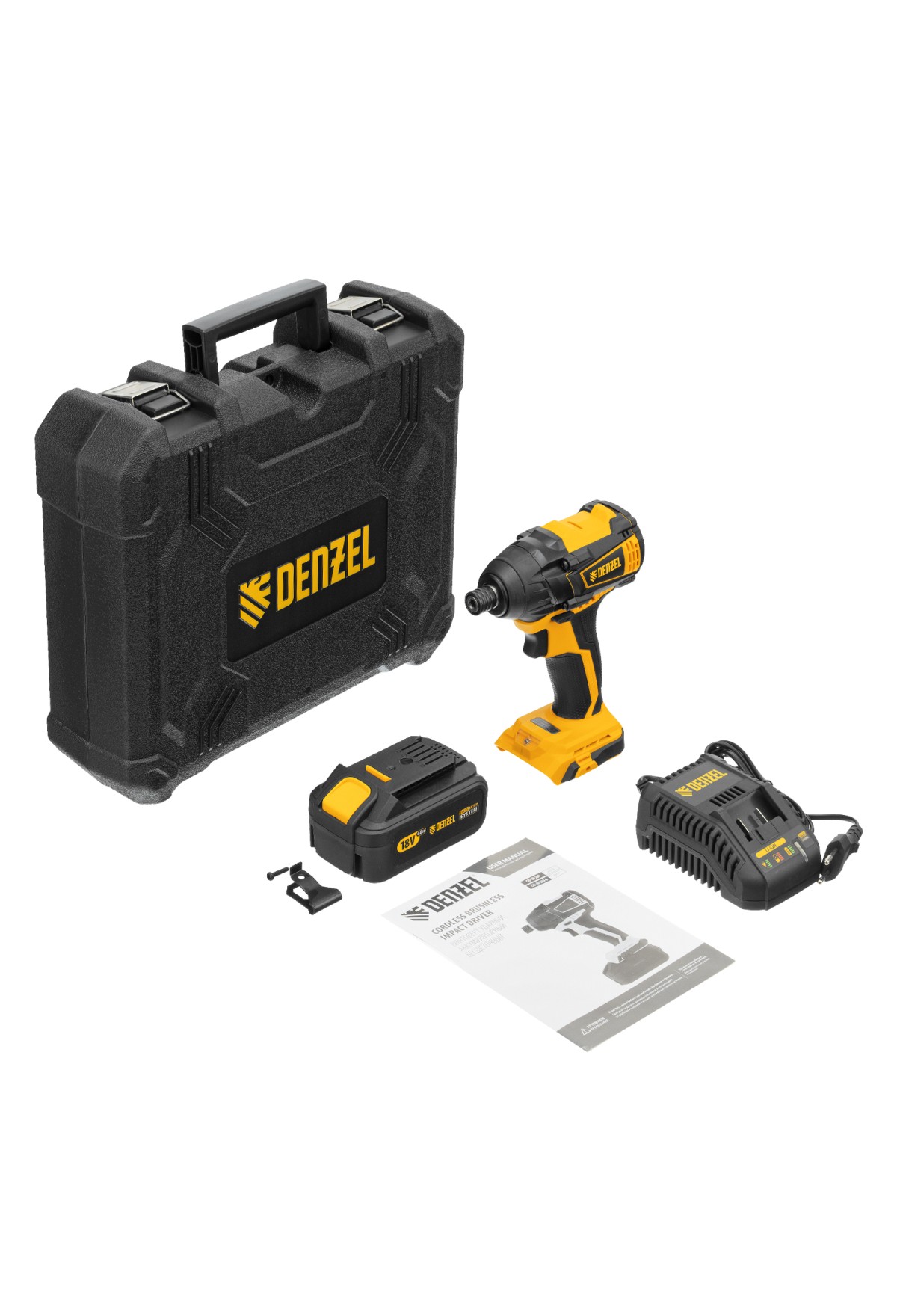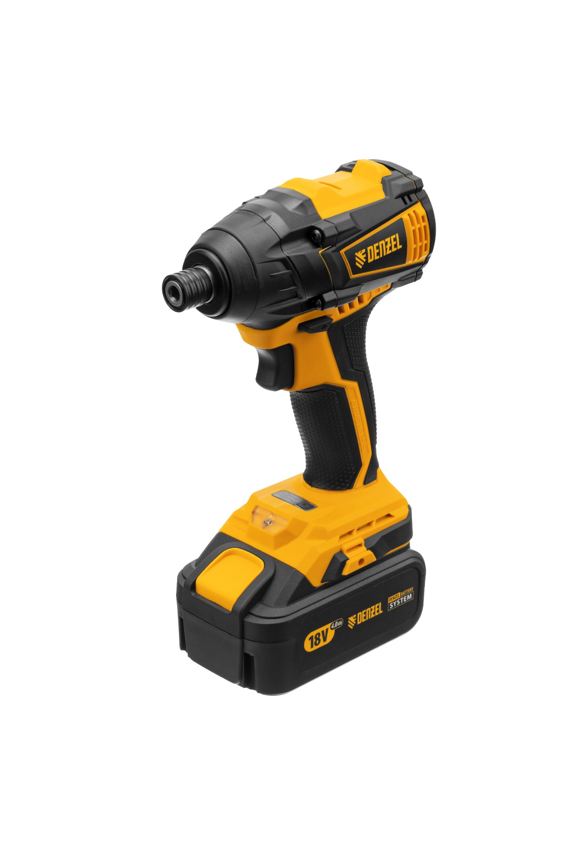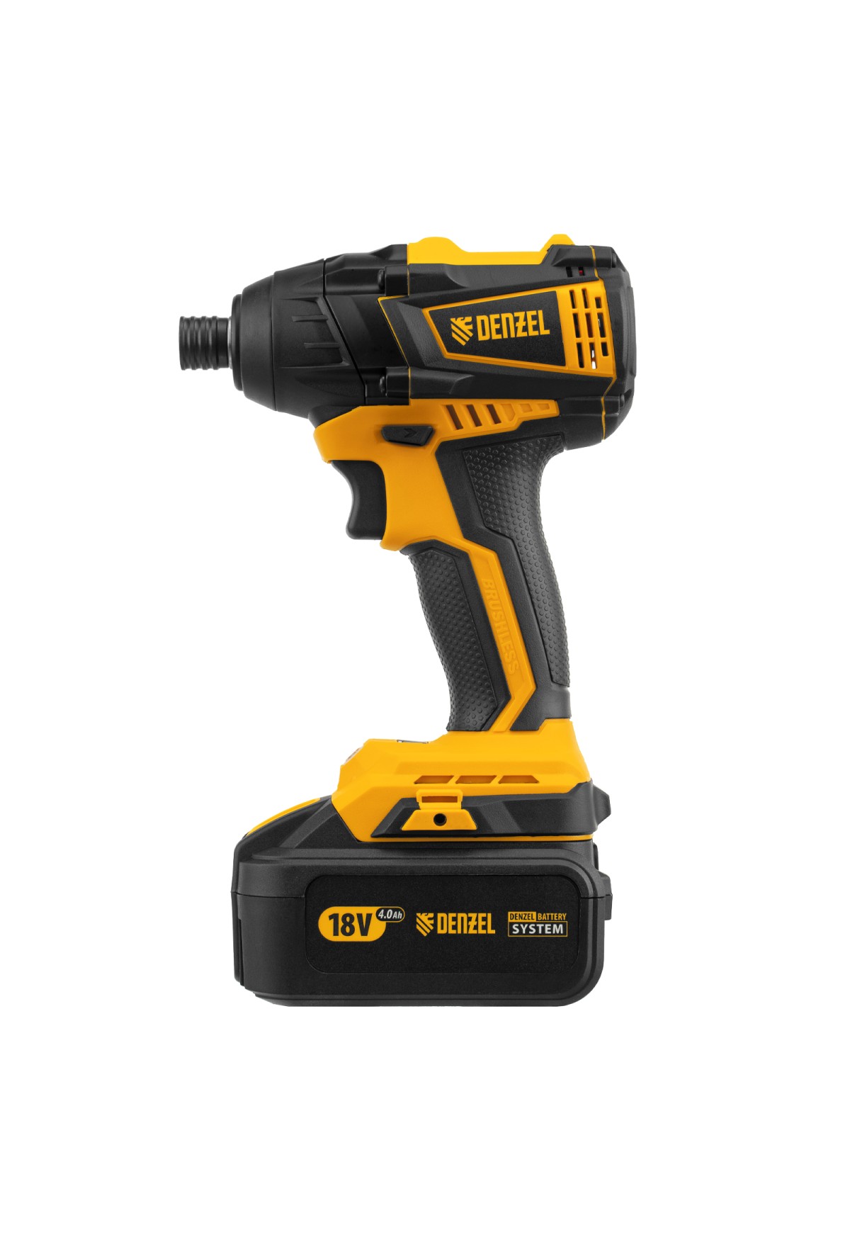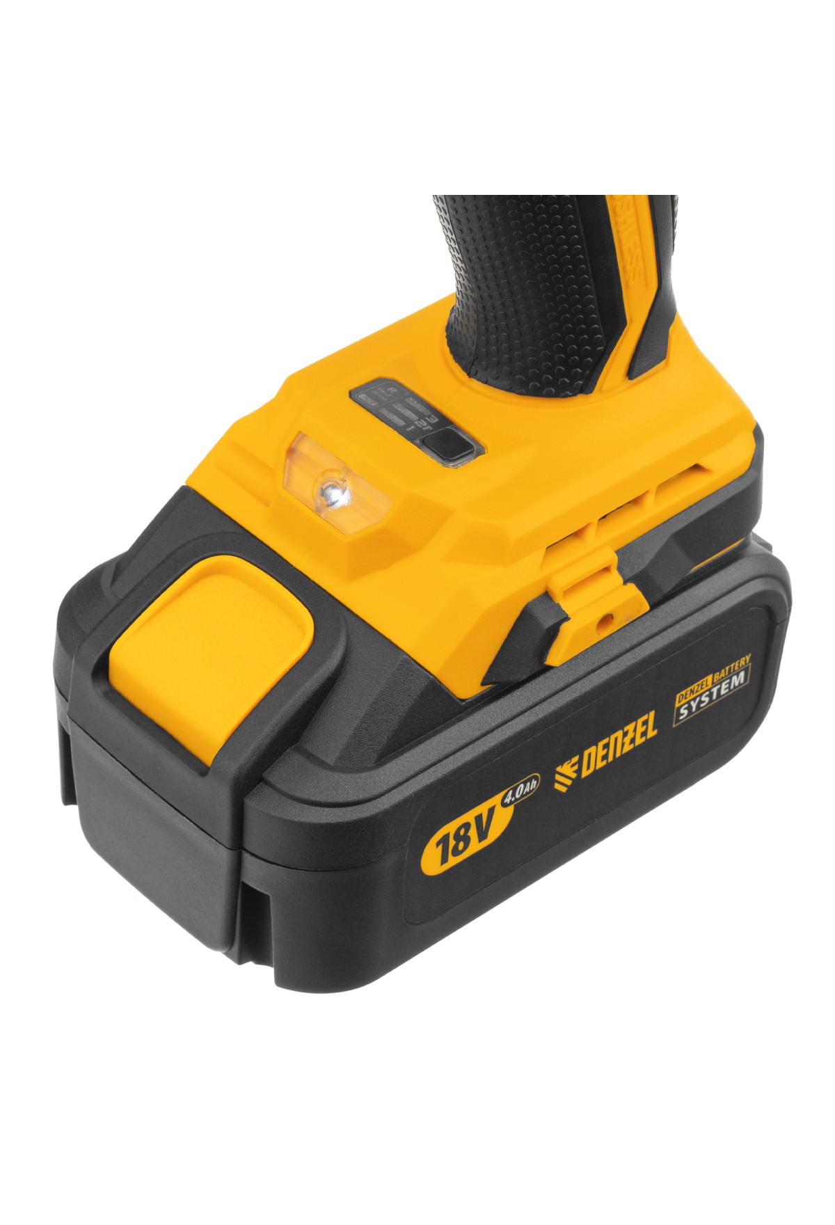 - Универсальность — к инструменту подойдут любые 18 В аккумуляторы Denzel battery system