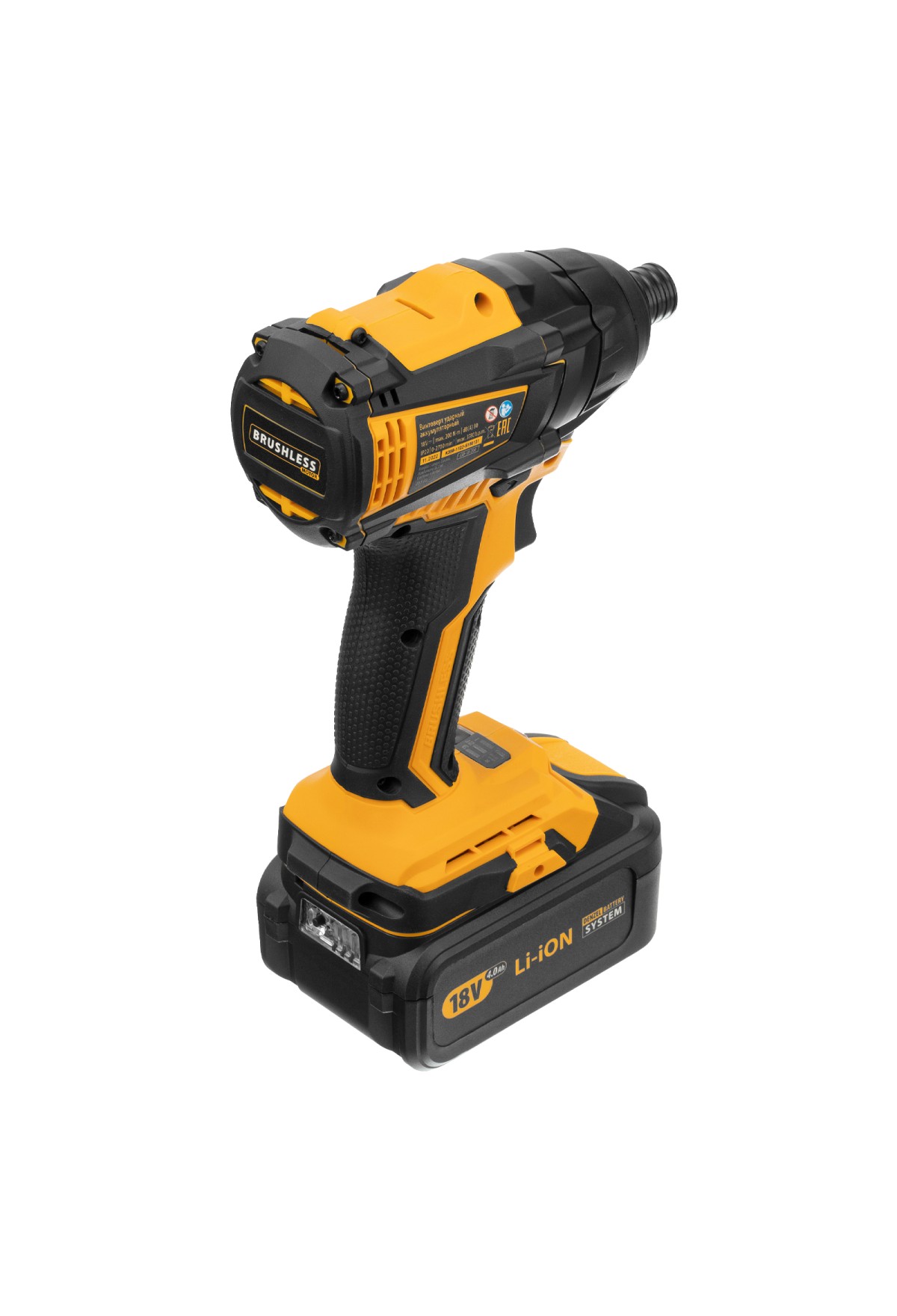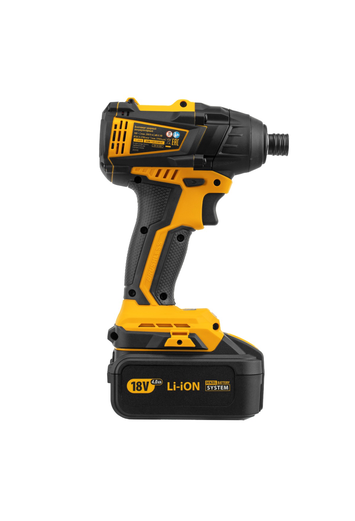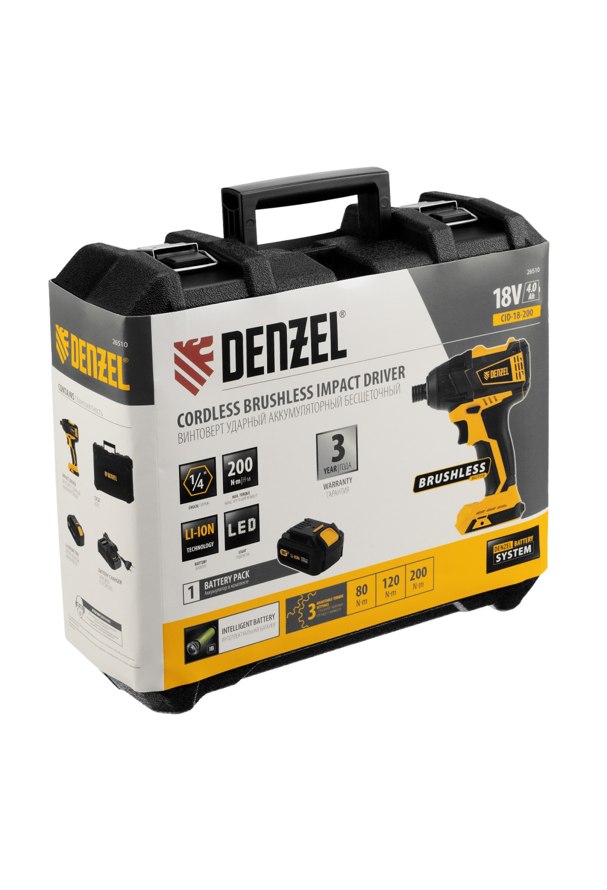 Ударный аккумуляторный винтоверт Denzel CID-IB-200 26510 с бесщеточным двигателем работает от батареи Li-Ion с рабочим напряжением 18 В и предназначен для завинчивания и отвинчивания винтов и шурупов, а также затягивания и откручивания гаек. Эффективен для демонтажа перетянутого и закисшего крепежа, закручивания длинных болтов и шурупов. Пригодится для сборки мебели и различных конструкций.,Аккумуляторный винтоверт не зависит от стационарного источника энергии. Интеллектуальная батарея емкостью 4 А/ч с защитой от перезаряда и глубокого разряда не имеет эффекта памяти, благодаря чему обеспечивает стабильную работу инструмента на протяжении длительного времени.