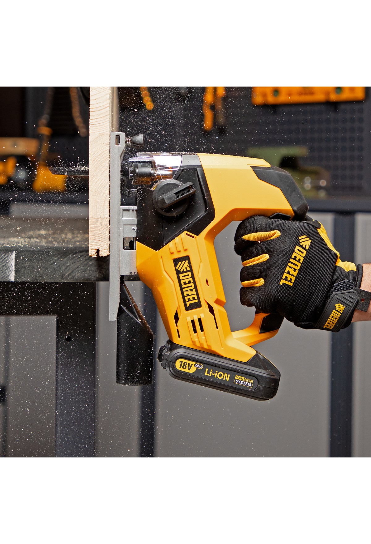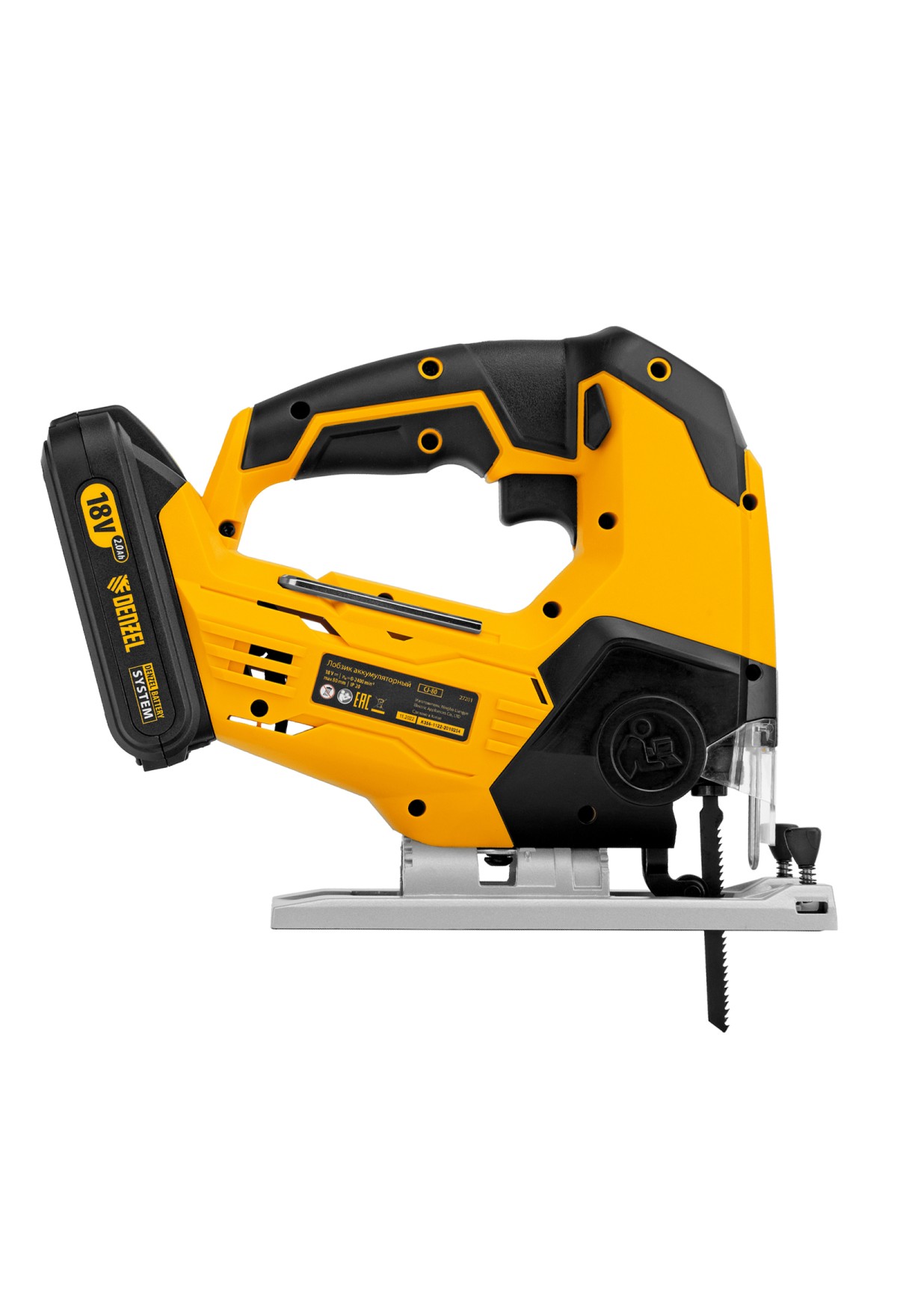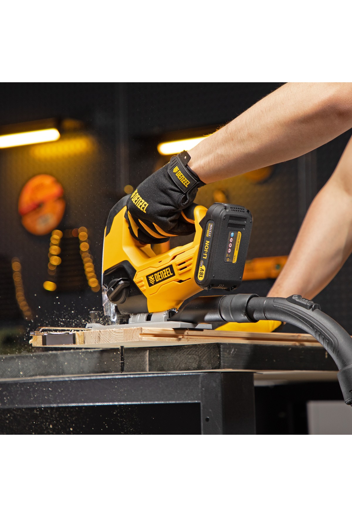 Аккумулятор с интеллектуальной системой распознавания нагрузки обеспечивает длительную работу лобзика и обладает высоким ресурсом. Совместим с любым аккумуляторным инструментом Denzel battery system 18V.