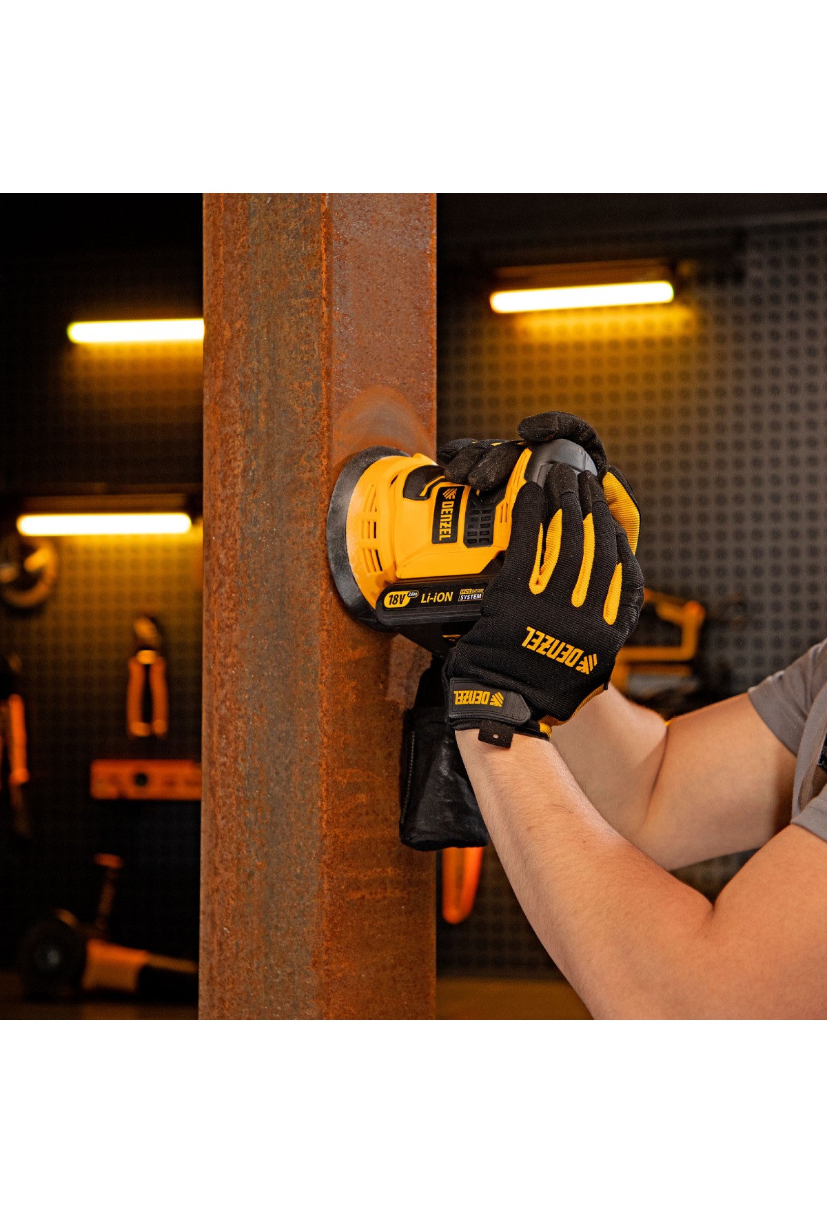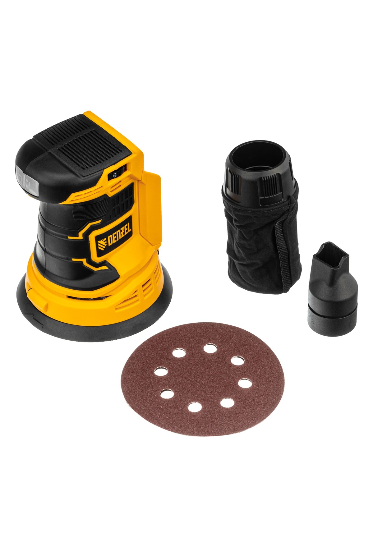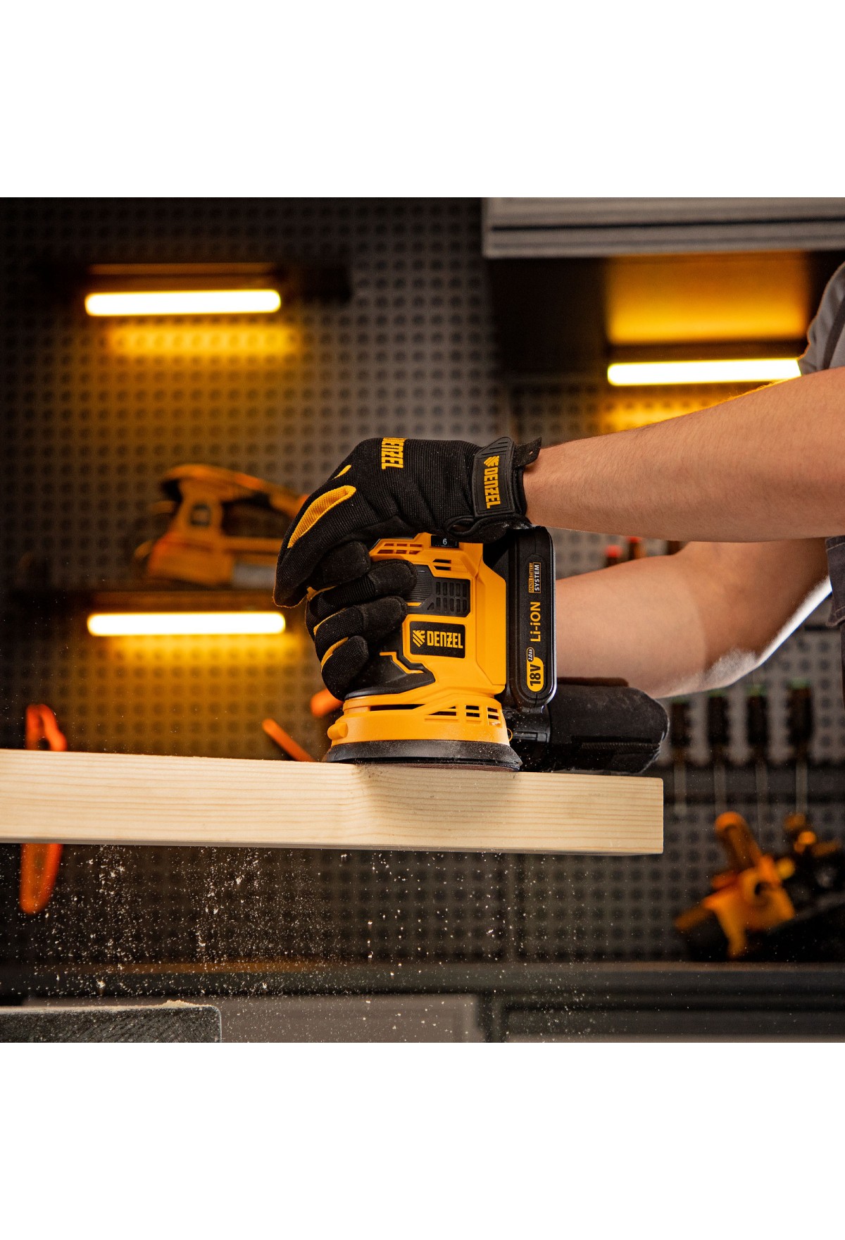 - Универсальность — к шлифовальной машине подходит аккумулятор 4Ач Li-ion, совместимый с любым инструментом 18V Denzel battery system серии IB (в комплект поставки не входит).