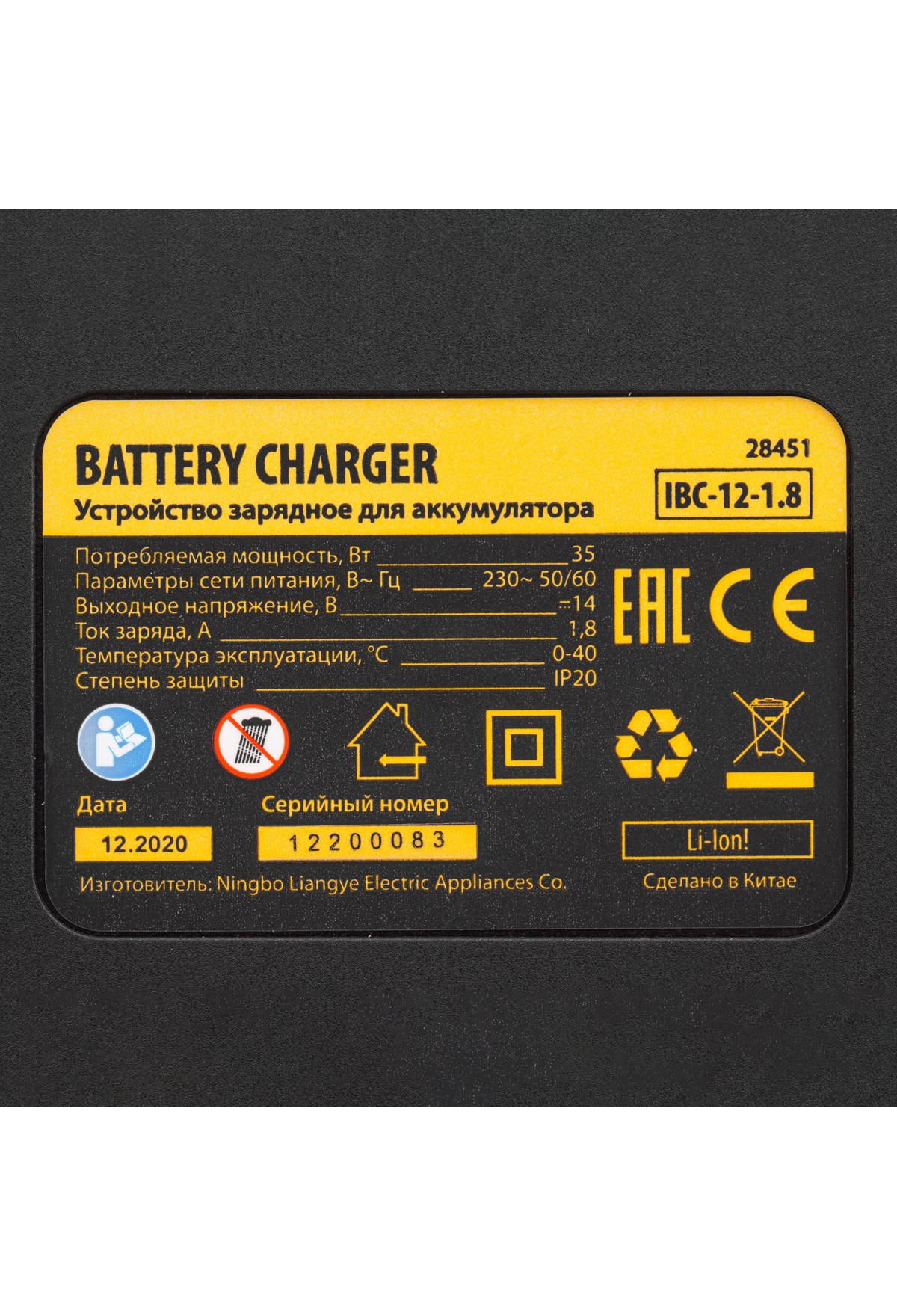 Технические характеристики Устройство зарядное для аккумуляторов IBC-12-1.8, Li-Ion, 12 В, 1.8 А Denzel