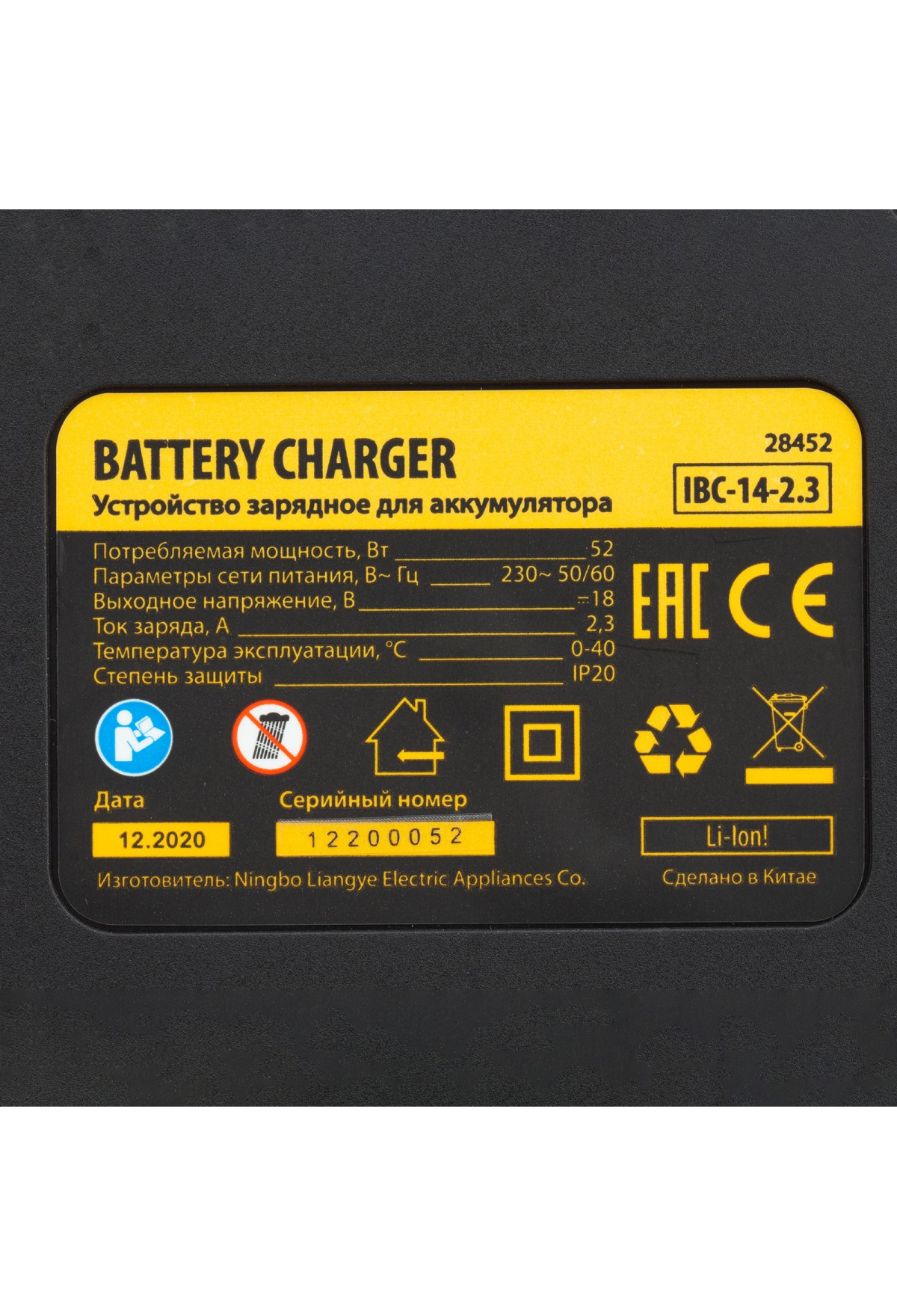 Технические характеристики Устройство зарядное для аккумуляторов IBC-14-2.3, Li-Ion, 14 В, 2.3 А Denzel