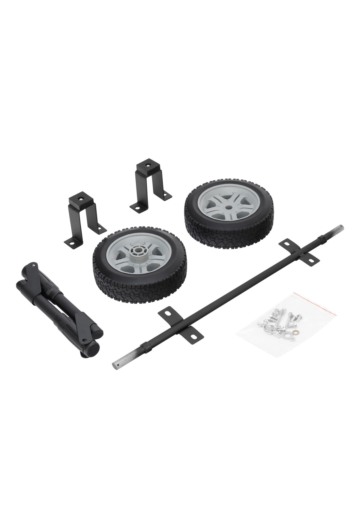 | Комплектация | Ручка - 2 штКолесо - 2 штОпора - 2 штОсь - 1 штСкоба крепления оси - 1 штБолт с фланцем М8 - 2 штМалый болт с фланцем М8 - 8 штГайка с фланцем М8 - 10 штШайба - 4 штШплинт - 2 шт |