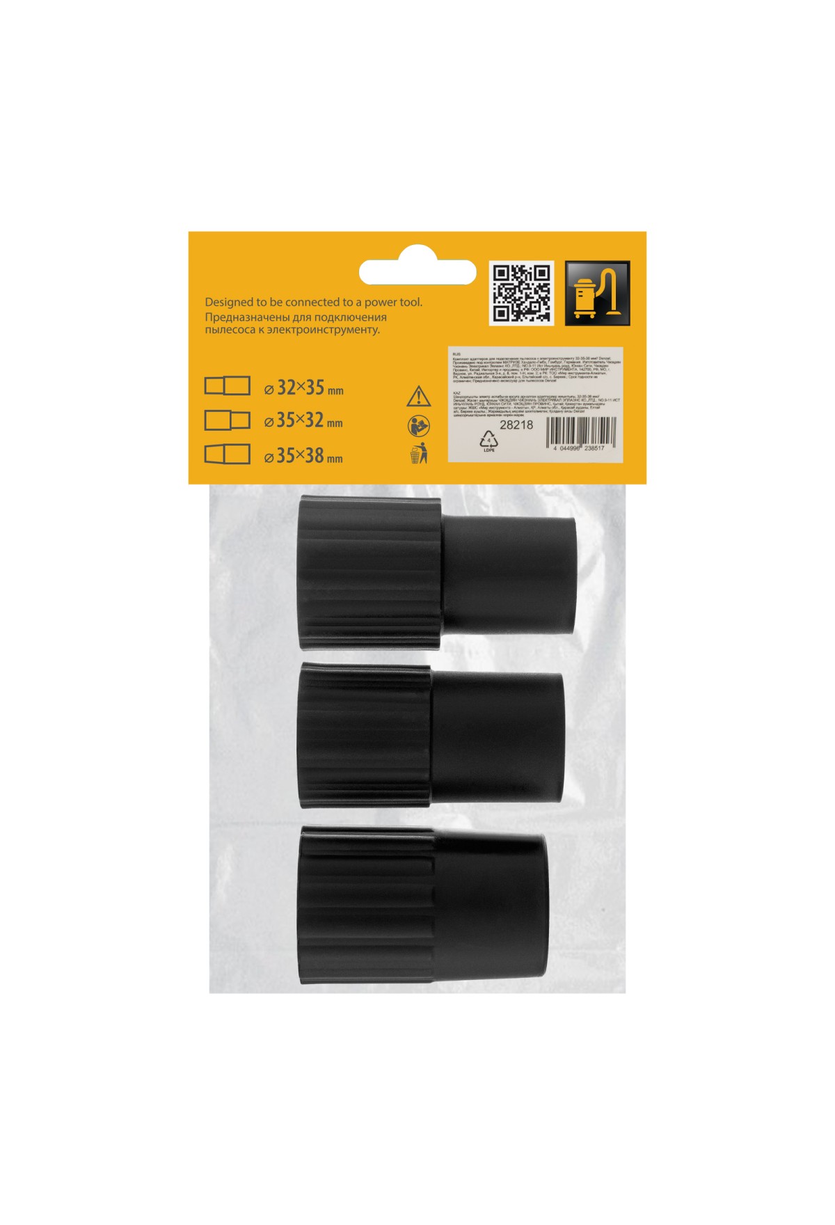 Комплект адаптеров Denzel 28218 включает 3 переходника размером 35 х 32 мм, 32 х 35 мм, 35 х 38 мм и служит для подключения пылесоса к электроинструменту. Такое решение позволяет обеспечить мгновенное удаление пыли, образующейся в процессе сверления, пиления, фрезерования.