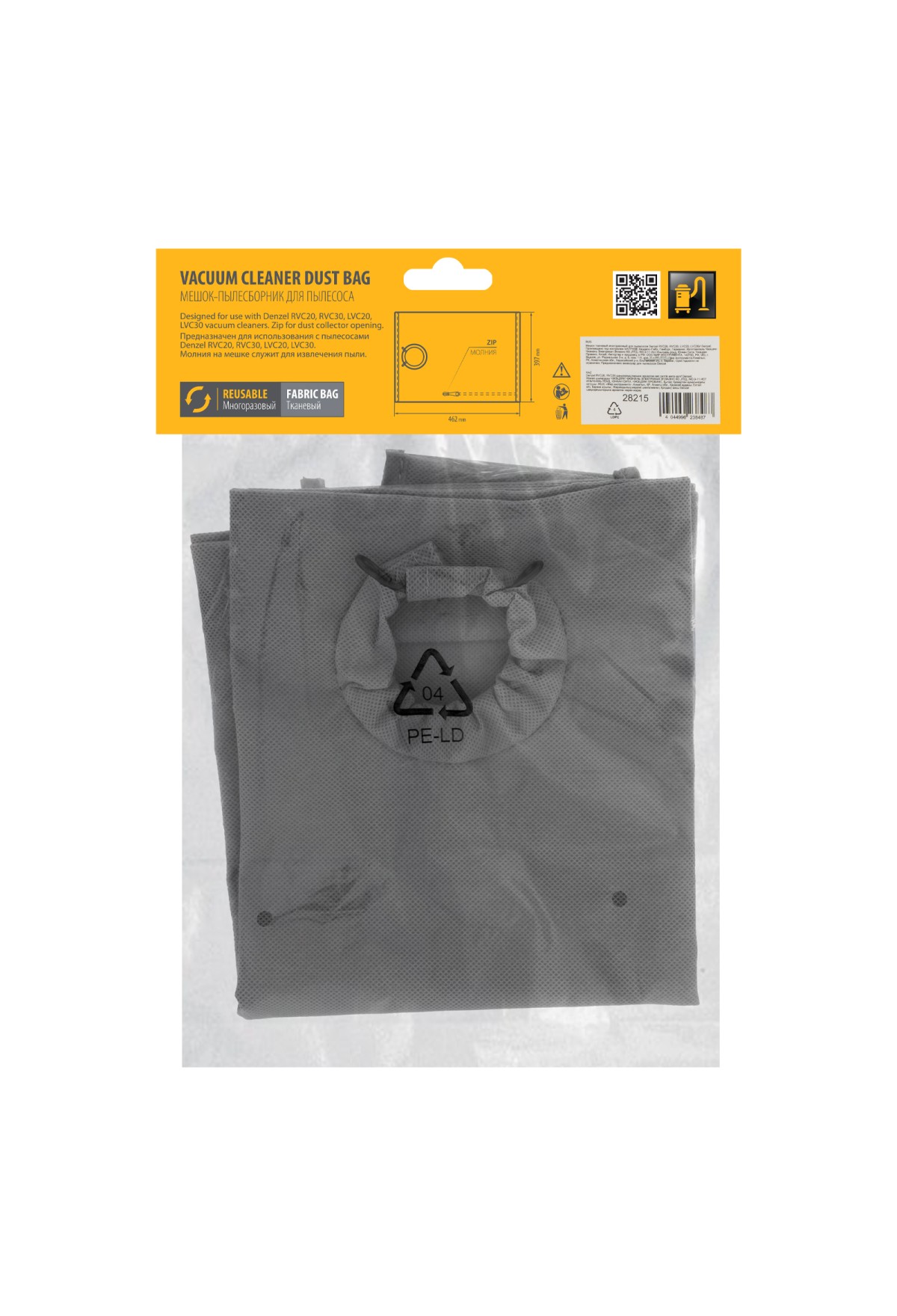 Многоразовый тканевый мешок Denzel 28215 — сменный аксессуар для строительных пылесосов RVC20 (28202), RVC30 (28203), LVC20 (28292), LVC30 (28293). Устанавливается в бак пылесоса и служит для сбора мусора во время сухой уборки.