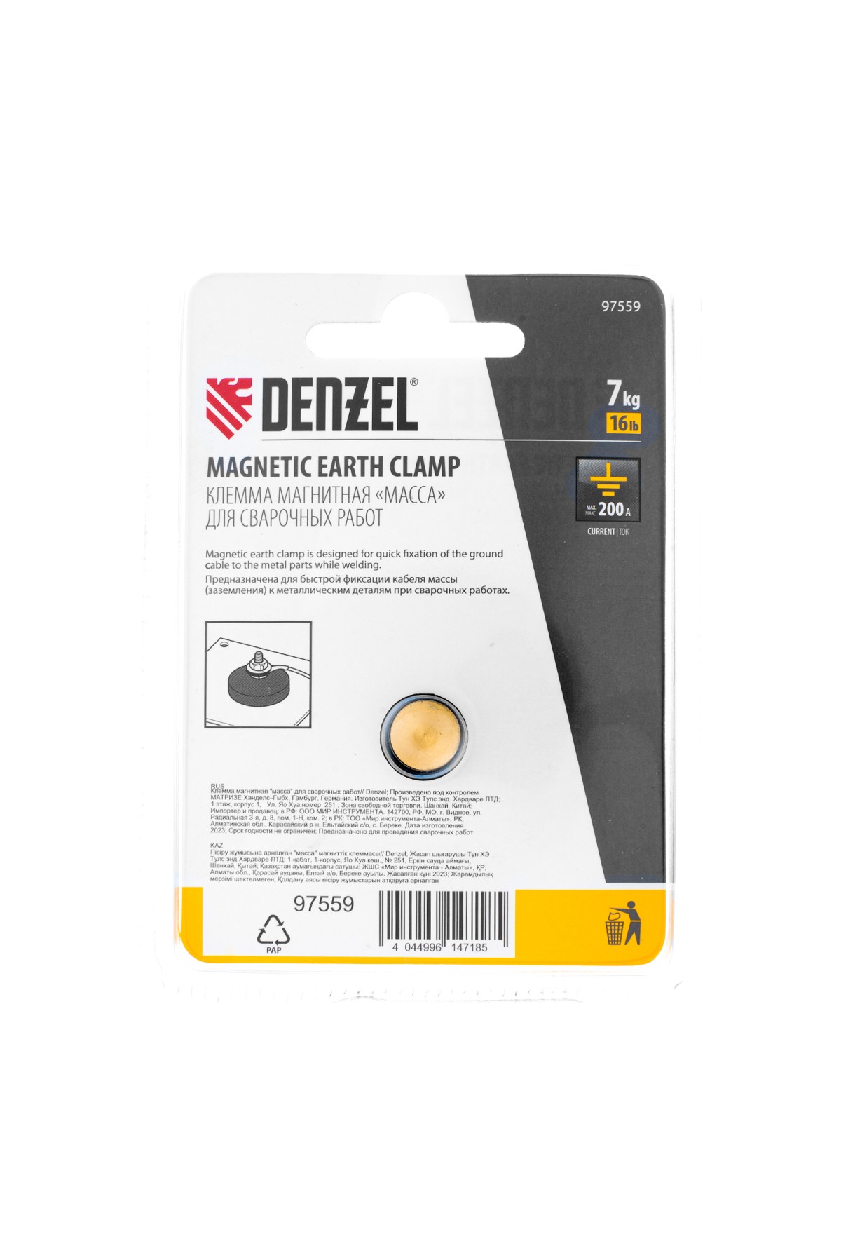 Магнитная клемма «масса» Denzel 97559 с максимальным током 200 А предназначена для соединения рабочего электрода с поверхностью обрабатываемого материала кабелем заземления. Она быстро и надежно крепится даже на изогнутые поверхности и обеспечивает замкнутую электрическую цепь, без которой невозможна ручная дуговая сварка. Клемма пригодится как начинающему, так и профессиональному сварщику при выполнении ремонтных работ и на строительной площадке.