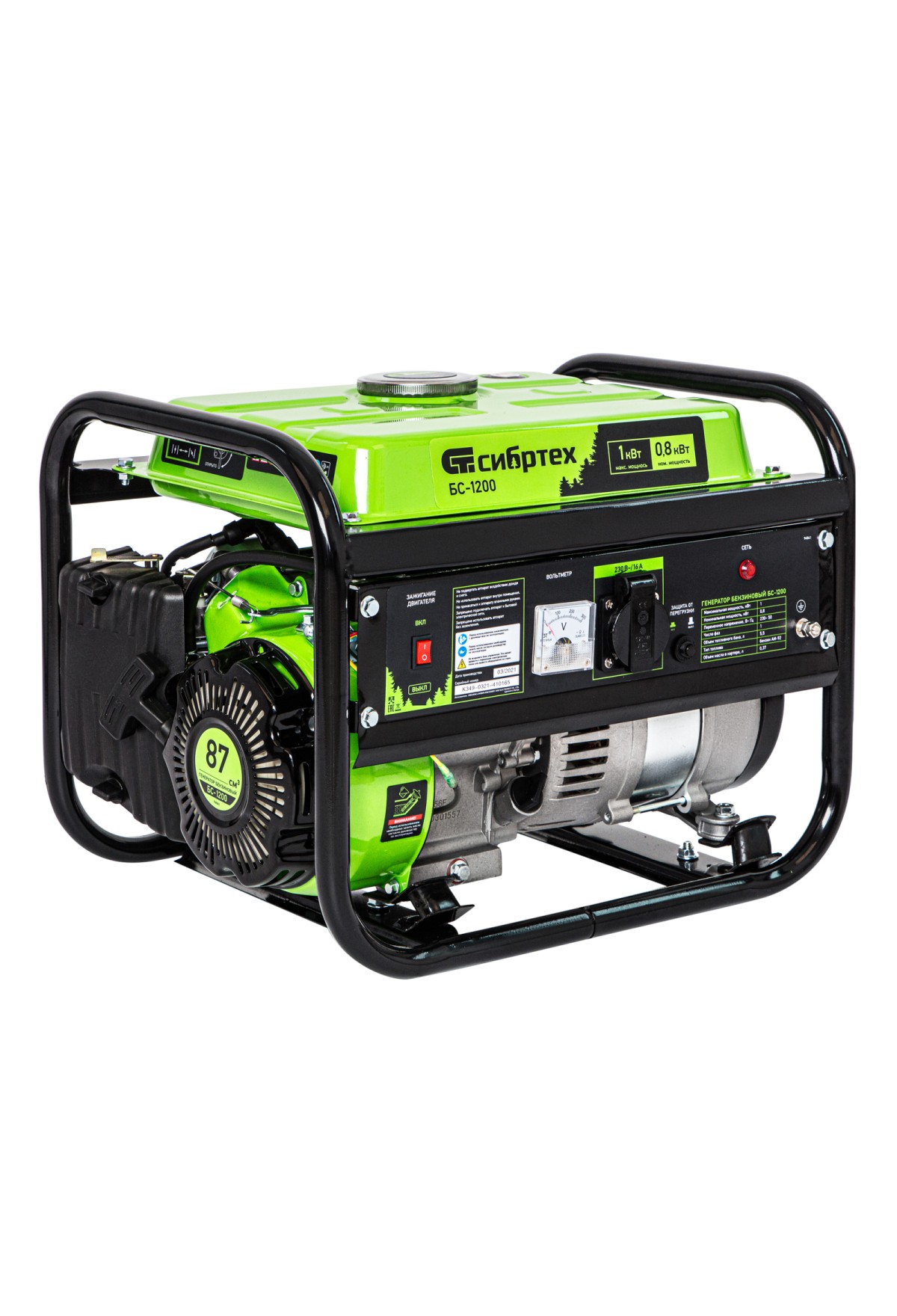Бензиновый генератор Сибртех БС-1200 94541 на 230 В, максимальной мощностью 1 кВт, с 4-тактным двигателем, с баком на 5,5 л и ручным стартером, может использоваться в качестве простой резервной системы электроснабжения на природе, в мастерской или на даче. Вырабатываемой мощности в 800 Вт хватит для одновременного обеспечения электричеством 4 ламп накаливания, компьютера и роутера. Также возможно подключение одного инструмента с высоким пусковым током (не превышающим 1000 Вт), такого как дрель, перфоратор, углошлифовальная машина.