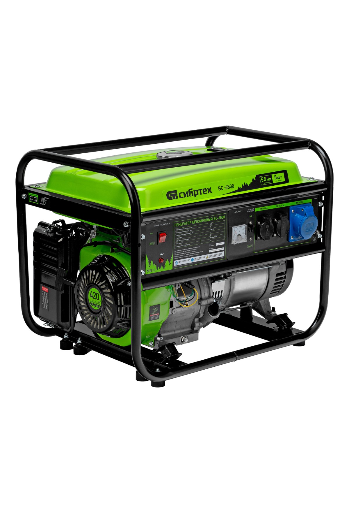 Бензиновый генератор Сибртех БС-6500 94546 на 230 В, с 4-тактным двигателем, баком на 25 л и ручным стартером, выдает 5,5 кВт и подходит для создания целой электросети в загородном доме, магазине, мастерской или на строительной площадке. К нему можно одновременно подключить 5 ламп накаливания, холодильник, телевизор. Для подключения приборов предусмотрено 3 розетки. Одна из них силовая на 32А, что позволяет запитать мощное оборудование, например, электрическую плиту.