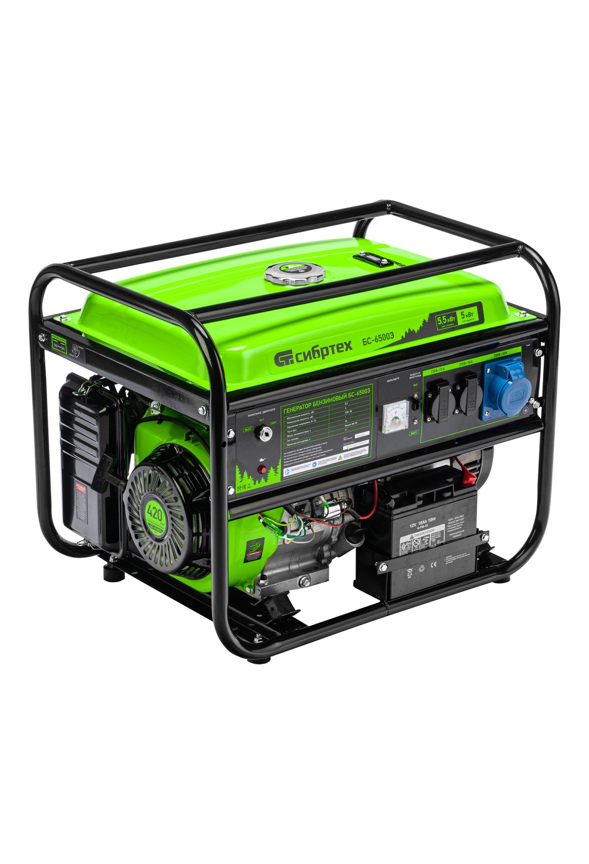 Бензиновый генератор Сибртех БС-6500Э 94548 максимальной мощностью 5,5 кВт, с 4-тактным двигателем, электростартером и баком объемом 25 л, выдает напряжение 230 В и используется для электроснабжения на даче, на строительной площадке, в магазине, в мастерской или гараже. Мощности хватает для обеспечения работы электроинструмента или одновременного подключения 4 ламп накаливания, телевизора, плиты и холодильника. Благодаря электростартеру запуск генератора осуществляется одним поворотом ключа.