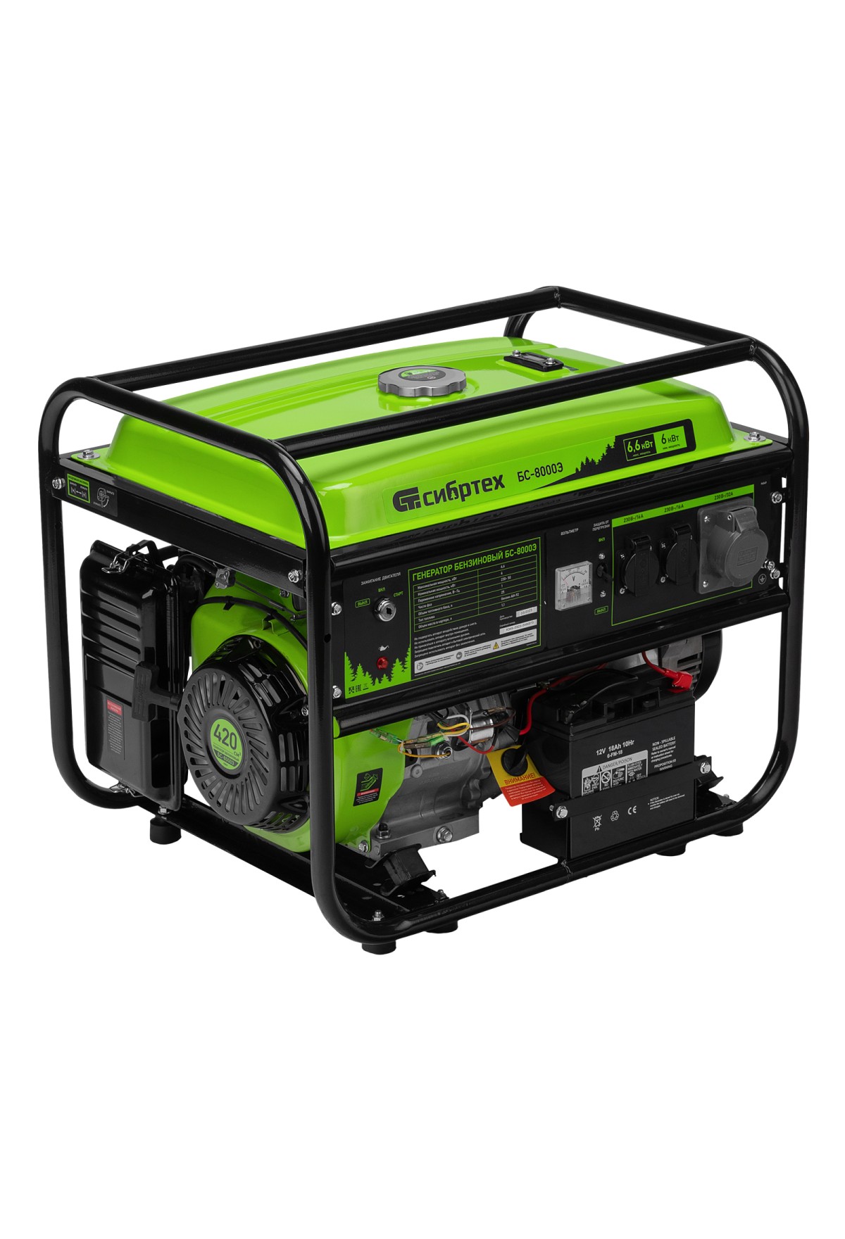 Бензиновый генератор Сибртех БС-8000Э 94549 мощностью 6,6 кВт, с 4-тактным двигателем, электростартером и баком объемом 25 л, выдает напряжение 230 В и является самым производительным в линейке. Подойдет для дачи, строительной площадки, мастерской, гаража или магазина. Благодаря мощности 6,6 кВт и наличию силовой розетки способен обеспечить бесперебойную работу нескольких потребителей одновременно, например, электрической плиты, холодильника, 5 ламп накаливания. Электростартер облегчает запуск — для начала работы достаточно просто повернуть ключ.