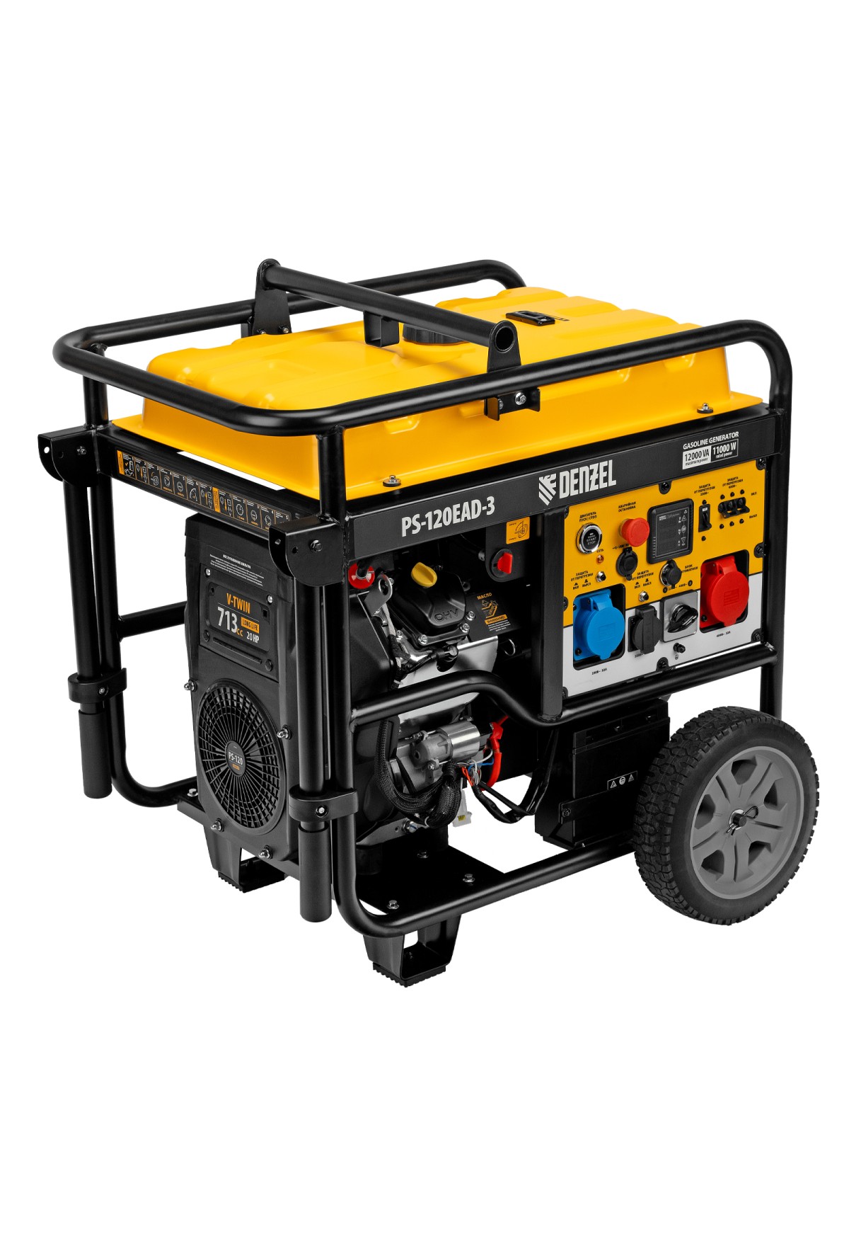 Бензиновый генератор Denzel PS-120EAD-3 946984 максимальной мощностью 12 кВт, с баком объемом 40 л, разъемом ATS, переключателем режима и электрическим стартером, способен поддерживать напряжение в сети 230/400 В. Предназначен для обеспечения питанием приборов и оборудования в случае отсутствия стационарной сети или перебоев в ее работе. Подключение потребителей производится при помощи розетки 230 В/16 А, а также силовой розетки 230 В/32 А и розетки трехфазного тока 400 В/32 А. Разъем USB 5 В позволяет заряжать мобильные устройства.,Мощное оборудование можно подключить напрямую через распределительную коробку. Генератор работает как в трехфазном, так и в однофазном режиме без потери мощности. Выбор режима осуществляется при помощи переключателя на передней панели. Генератор пригодится в загородном доме, на производстве или строительной площадке.