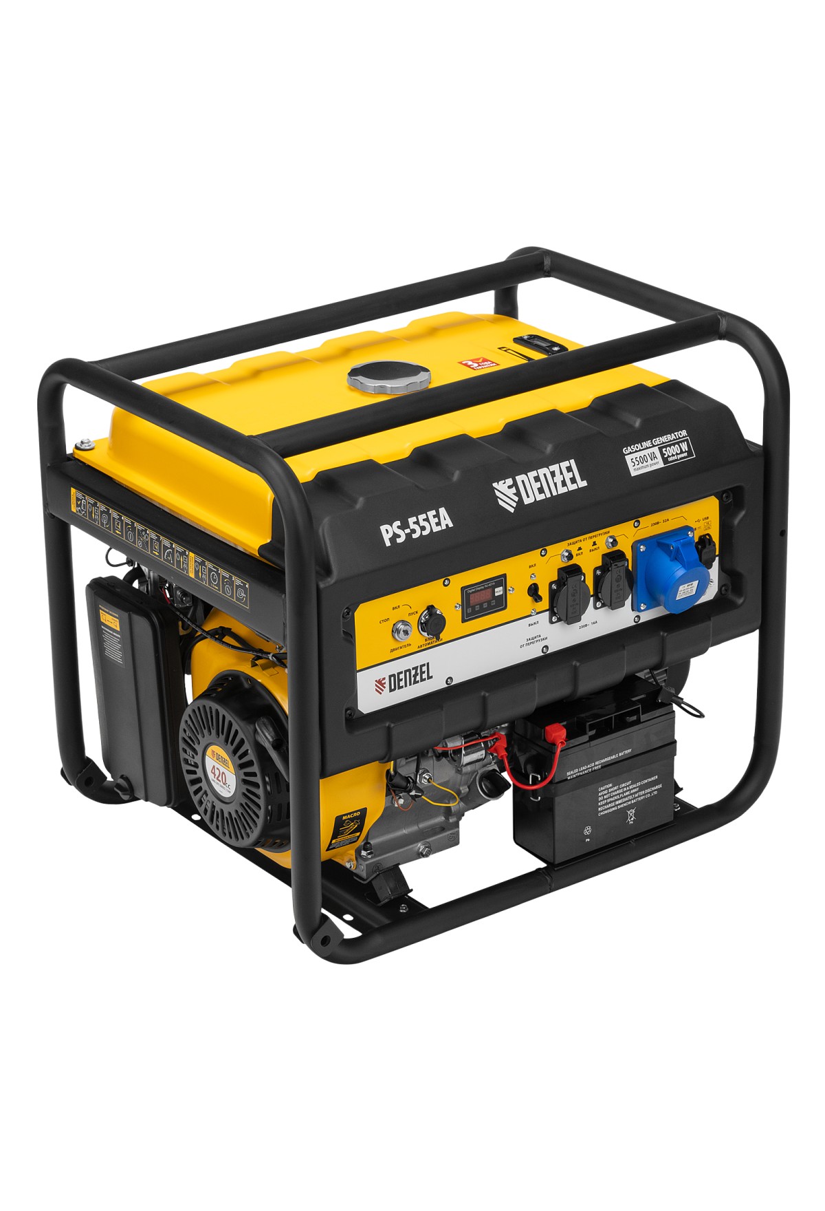 Бензиновый генератор Denzel PS 55 EA 946874 мощностью 5,5 кВт, с коннектором автоматики и электростартером, имеет бак объемом 25 л и поддерживает напряжение в сети 230 В. Подходит для подключения мощных электроинструментов и бытовых приборов, незаменим в условиях отсутствия электричества. В доме можно одновременно использовать 3 лампы накаливания, холодильник, телевизор, утюг, электрочайник. На стройплощадке можно подключить шлифовальную машину, дрель, циркулярную пилу, бетономешалку, компрессор. Выход постоянного тока USB 5 В позволяет использовать генератор для зарядки смартфона, планшета и других мобильных устройств.