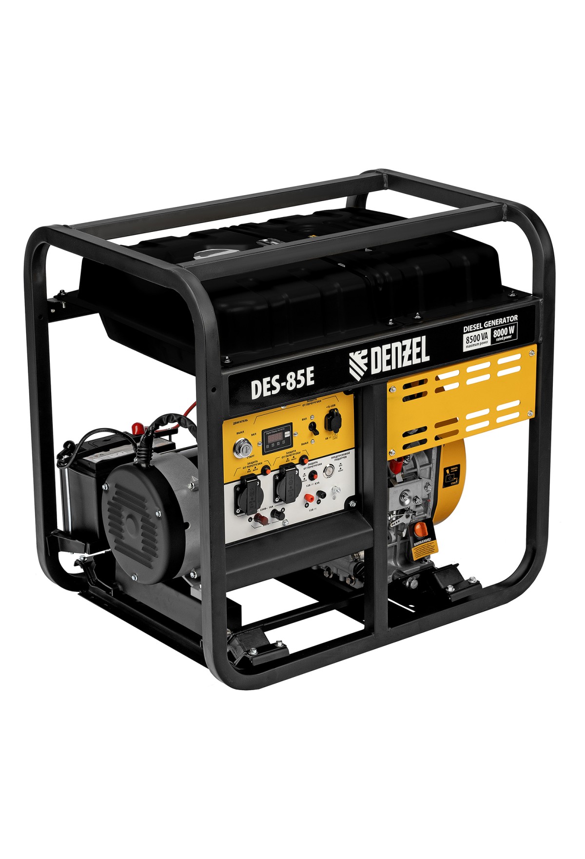Генератор дизельный Denzel DES-85E 94415 с объемом топливного бака 16 л, с электростартером, имеет максимальную выходную мощность 8,5 кВт и поддерживает напряжение в сети 230 В. Используется для снабжения энергией потребителей однофазного тока (осветительных приборов, бытовой техники, электроинструмента) при отсутствии доступа к стационарному источнику питания. Для подключения электроприборов служат 2 розетки 230 В/16 А. Силовые клеммы позволяют снять полную мощность. Клеммы постоянного тока 12 В позволяют заряжать автомобильные аккумуляторы, а двойной выход USB 5 В предназначен для подключения мобильных устройств (планшетов, смартфонов и т. д.). Генератор пригодится в загородном доме.
