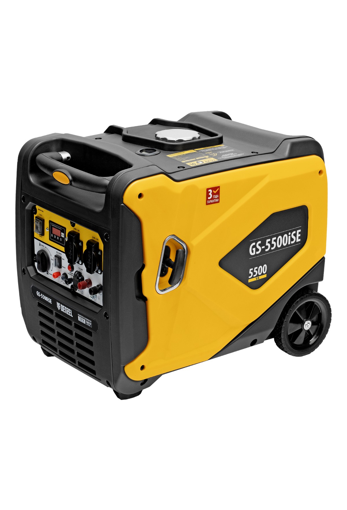 - Удобная транспортировка — колеса и телескопическая рукоятка облегчают перемещение генератора.