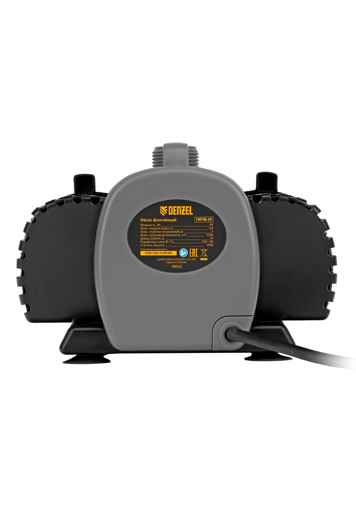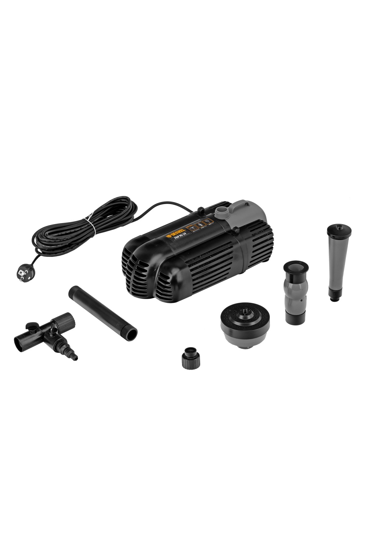 Фонтанный насос Denzel FNP90-39 99033 мощностью 92 Вт, с насадками колокольчик/каскад/гейзер, перекачивает 3200 л воды в час и обеспечивает максимальную высоту подъема 3,9 м. Позволяет создать декоративный фонтан, украсив водоем и оживив ландшафт дачного участка. Установив одну из входящих в комплект насадок, можно получить наиболее подходящий тип струи: в виде колокольчика, каскада или гейзера. Также в конструкции насоса предусмотрен специальный патрубок для создания водопада.
