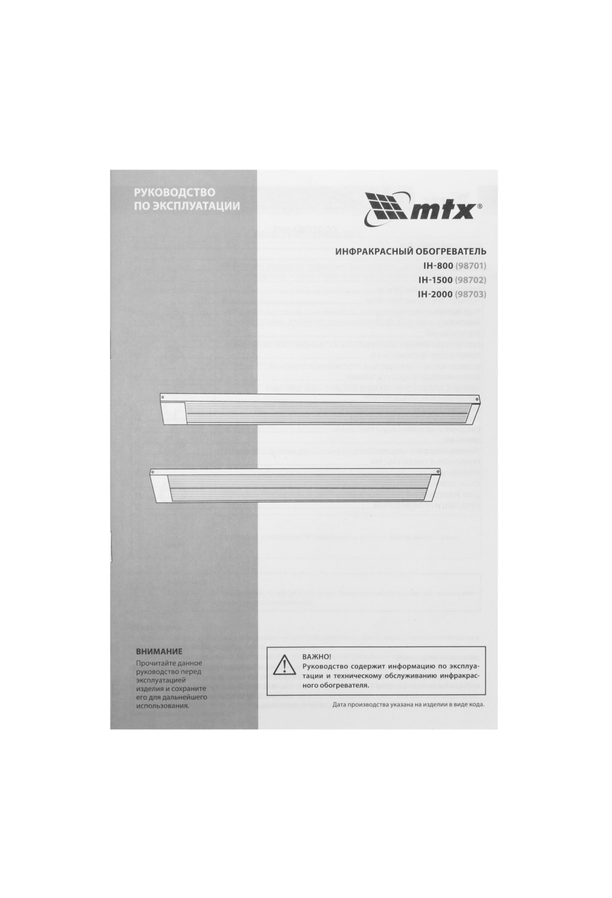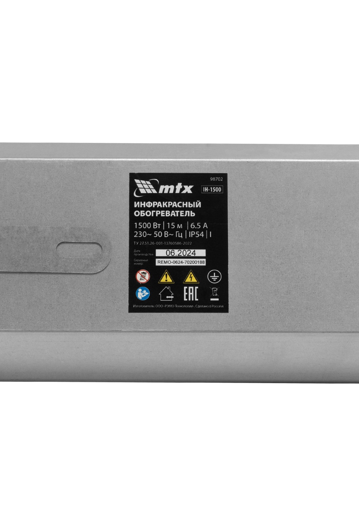 Инфракрасный обогреватель MTX IH-1500 98702 подключается к сети 230 В, потребляет мощность до 1500 Вт, защищен по стандарту IP54 и оснащен кабелем длиной 1,8 м с вилкой. Предназначен для обогрева помещений в холодное время года. Служит основным источником тепла на площади до 13 кв. м и дополнительным — в помещениях до 26 кв. м.