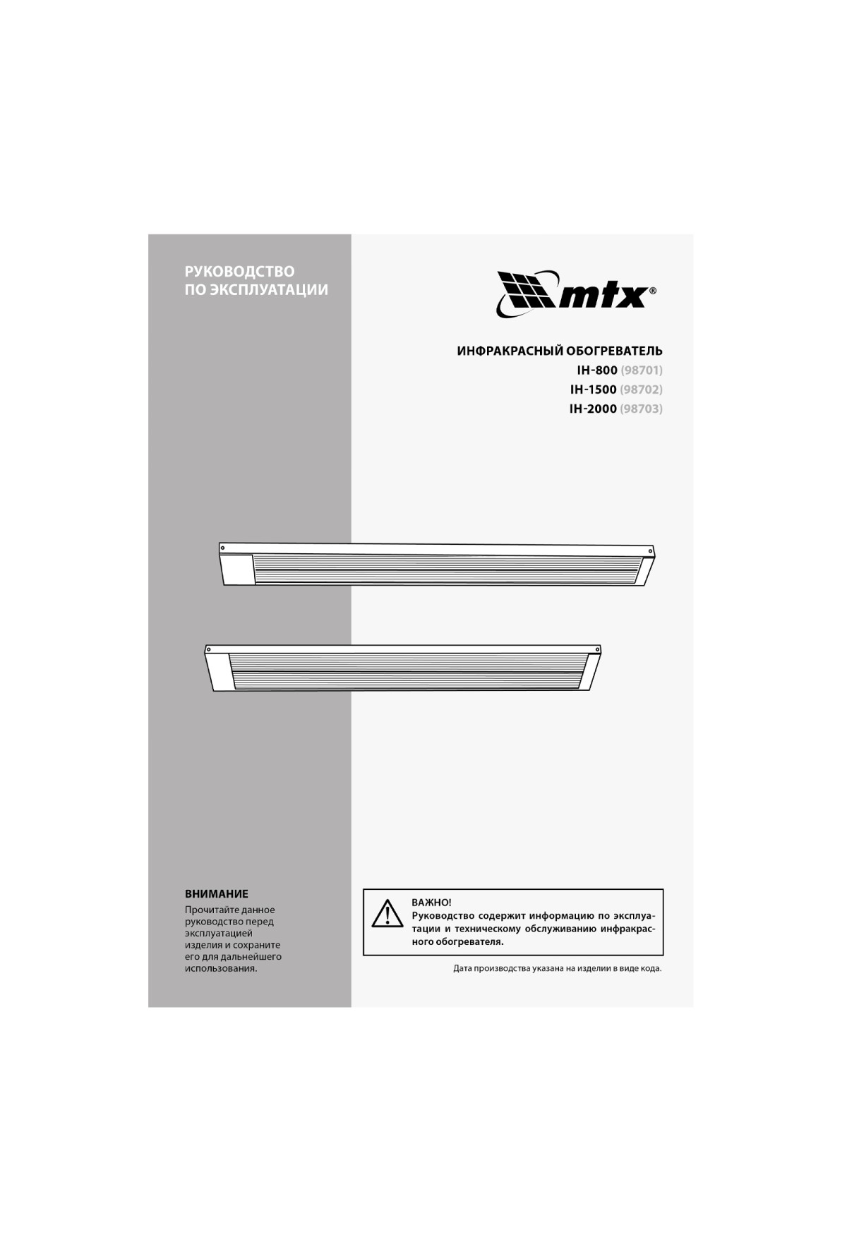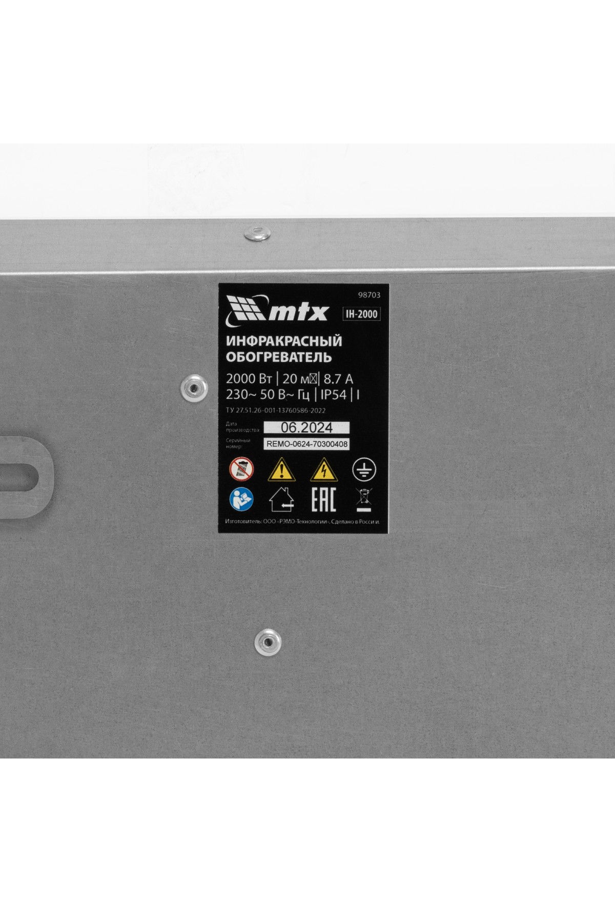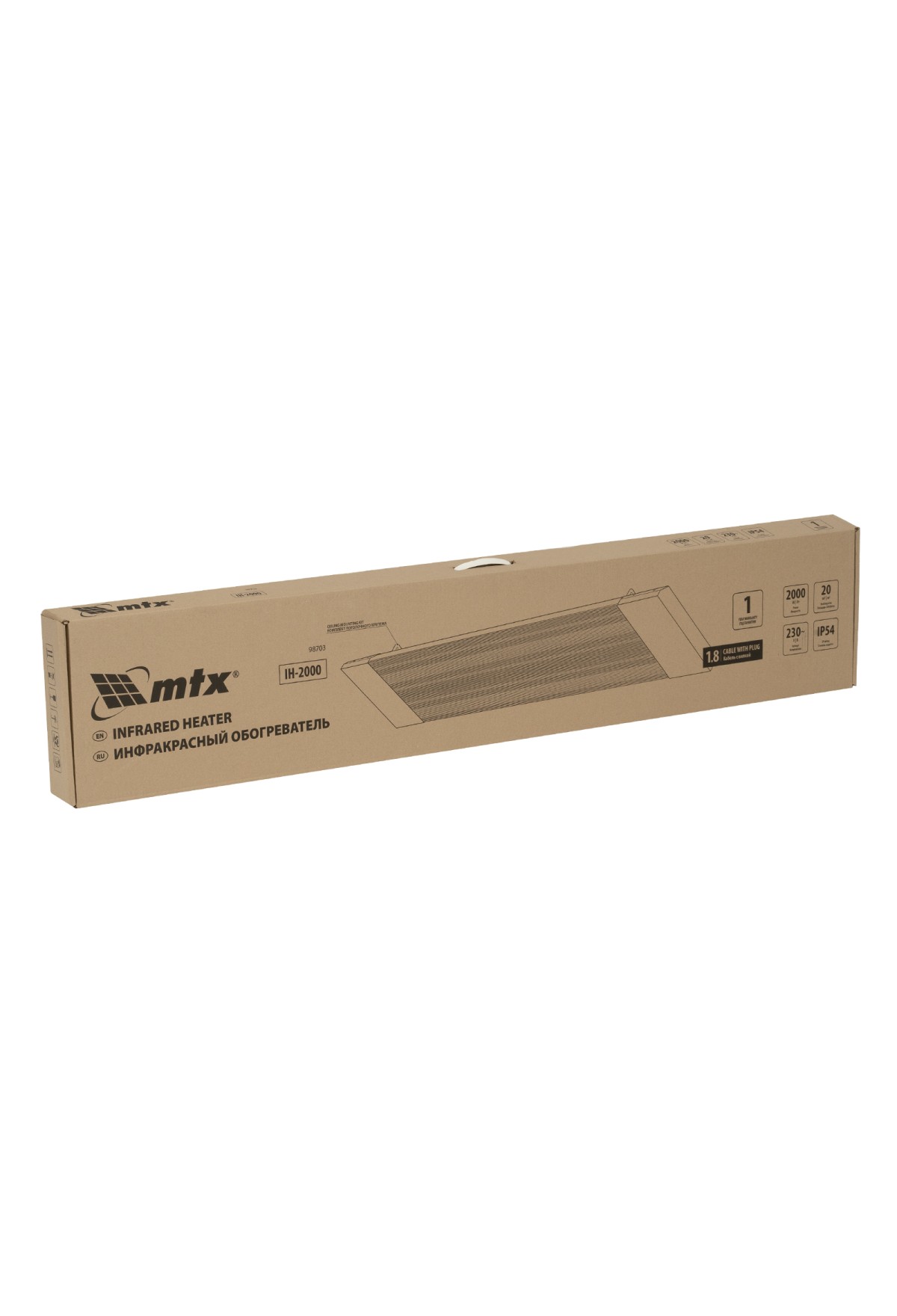 Инфракрасный обогреватель MTX IH-2000 98703 подключается к сети 230 В, потребляет мощность до 2000 Вт, защищен по стандарту IP54 и оснащен кабелем длиной 1,8 м с вилкой. Предназначен для обогрева помещений в холодное время года. Служит основным источником тепла на площади до 20 кв. м и дополнительным — в помещениях до 40 кв. м.