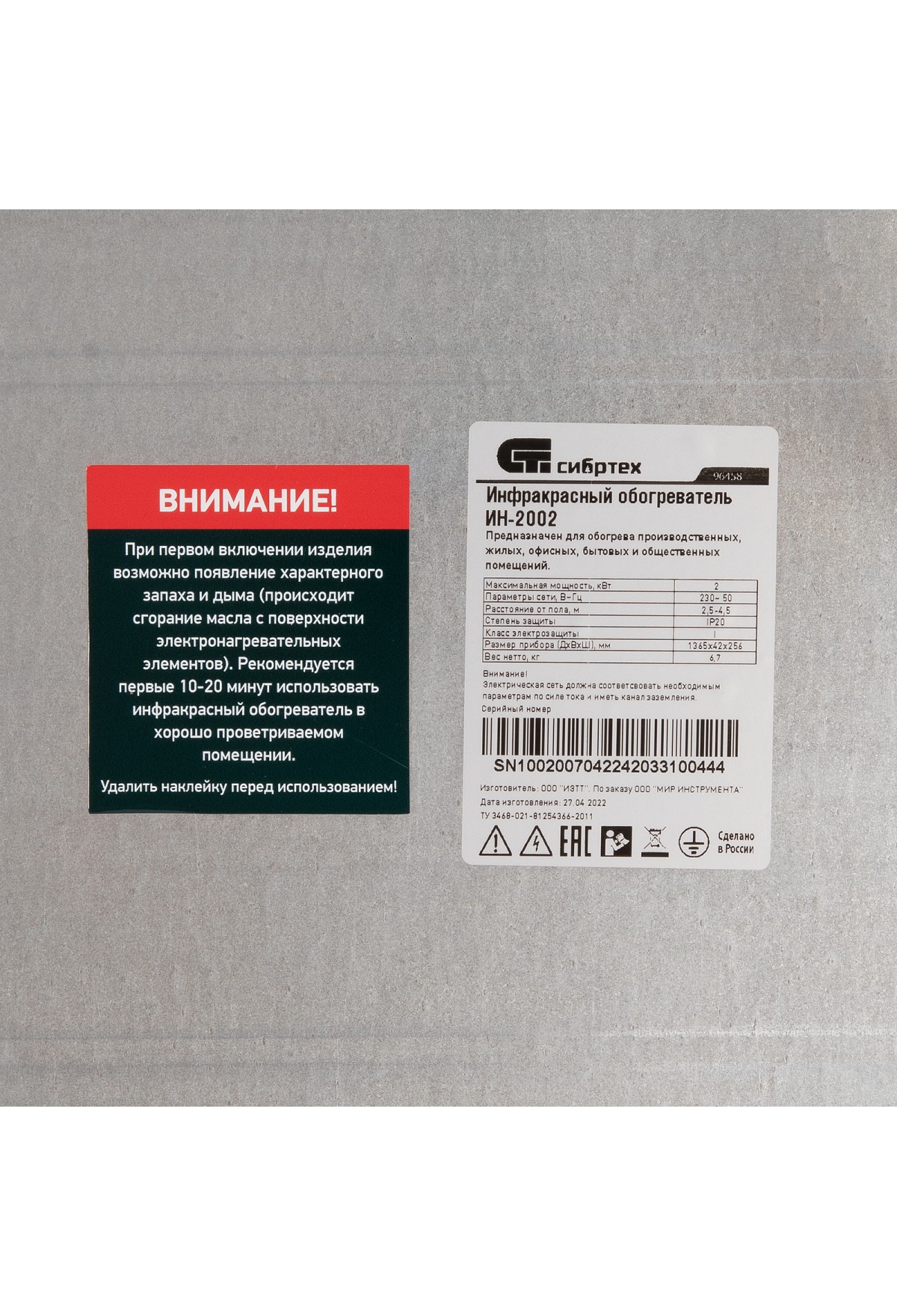 Инфракрасный обогреватель Сибртех ИН-2002 96458 подключается к сети 230 В, потребляет мощность до 2000 Вт и предназначен для создания комфортных температурных условий в помещении в холодное время года. Служит основным источником тепла на площади до 20 кв. м и дополнительным — в помещениях до 40 кв. м.,Одно из ключевых преимуществ обогревателя — энергоэффективность. Инфракрасное тепло передается сквозь воздух, не нагревая его, а нагревая предметы, находящиеся на расстоянии. Примерно по такому принципу на Землю передается тепло от Солнца. Вы ощутите его сразу, не дожидаясь прогрева всего воздуха в помещении.