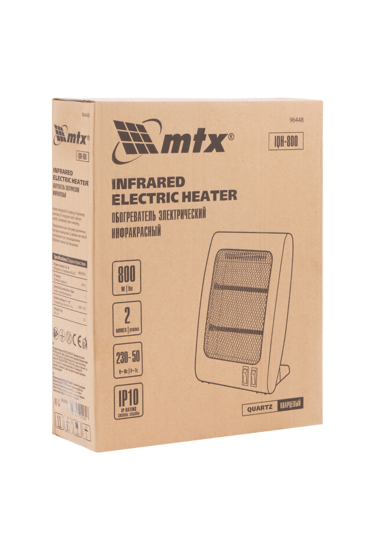 Инфракрасный обогреватель MTX IQH-800 96448 мощностью 800 Вт работает от сети 230 В и предназначен для обогрева помещений площадью до 8 кв. м. Экономичен, поскольку нагревает окружающие поверхности, не расходуя энергию на обогрев воздуха. Устройство подходит для использования в быту.