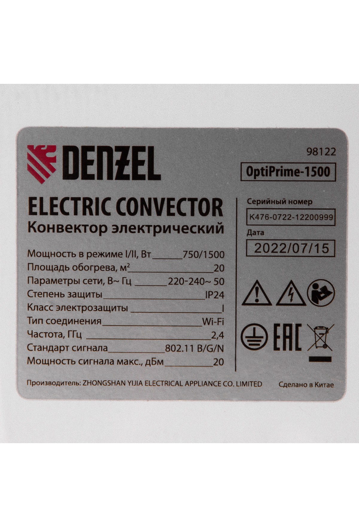 Электрический конвектор Denzel OptiPrime-1500 98122 максимальной мощностью 1500 Вт, с тачскрином, цифровым термостатом и функцией подключения к Wi-Fi, рассчитан на обогрев квартиры, дачи, загородного дома, офиса, а также пригодится в производственных, бытовых и общественных помещениях. Рекомендуемая площадь обогрева — 20 кв.м. Две мощности обогрева 750 и 1500 Вт позволяют поддерживать температуру в отапливаемой комнате и полностью прогревать холодные помещения.,Устройство оснащено Х-образным нагревательным элементом — самым долговечным среди аналогов, обеспечивающим максимально равномерный прогрев помещения. Конвектор не сушит воздух, не сжигает пыль и исключает появление неприятного запаха.