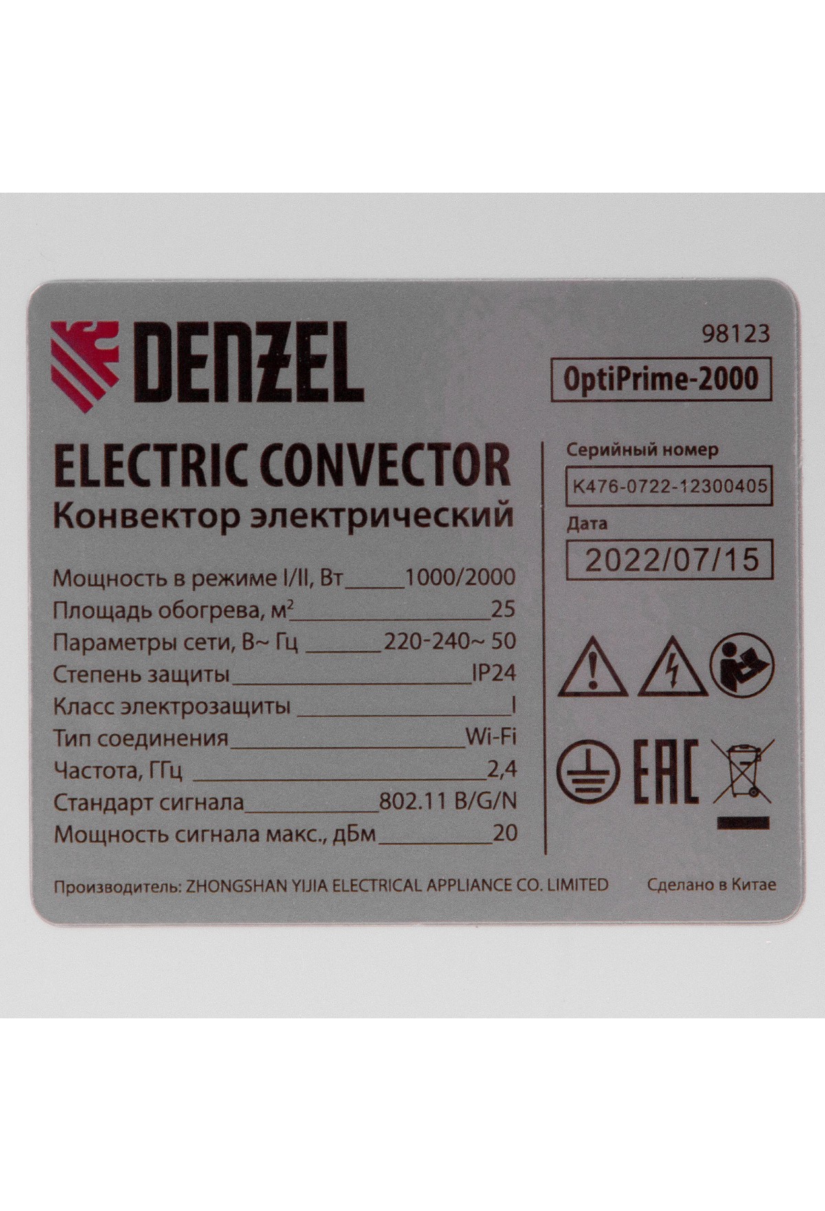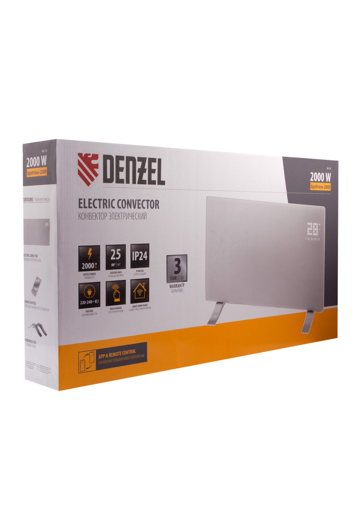 Электрический конвектор Denzel OptiPrime-2000 98123 максимальной мощностью 2000 Вт, с тачскрином, цифровым термостатом и функцией подключения к Wi-Fi, рассчитан на обогрев квартиры, дачи, загородного дома, офиса, а также пригодится в производственных, бытовых и общественных помещениях. Рекомендуемая площадь обогрева — 25 кв.м. Две мощности обогрева 1000 и 2000 Вт позволяют поддерживать температуру в отапливаемой комнате и полностью прогревать холодные помещения.,Устройство оснащено Х-образным нагревательным элементом — самым долговечным среди аналогов, обеспечивающим максимально равномерный прогрев помещения. Конвектор не сушит воздух, не сжигает пыль и исключает появление неприятного запаха.