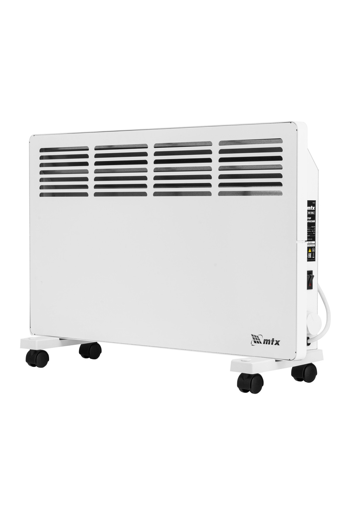 Конвектор электрический MTX KM-1500.2 98125 с X-образным нагревателем, колесами и термостатом, мощностью 1500 Вт, предназначен для использования в закрытых помещениях: квартирах, офисах, на производствах, в общественных местах и т.д. Рекомендуемая площадь обогрева составляет 20 кв.м. Х-образный нагревательный элемент обеспечивает быстрый и равномерный прогрев помещения до необходимой температуры, при этом не сушит воздух.