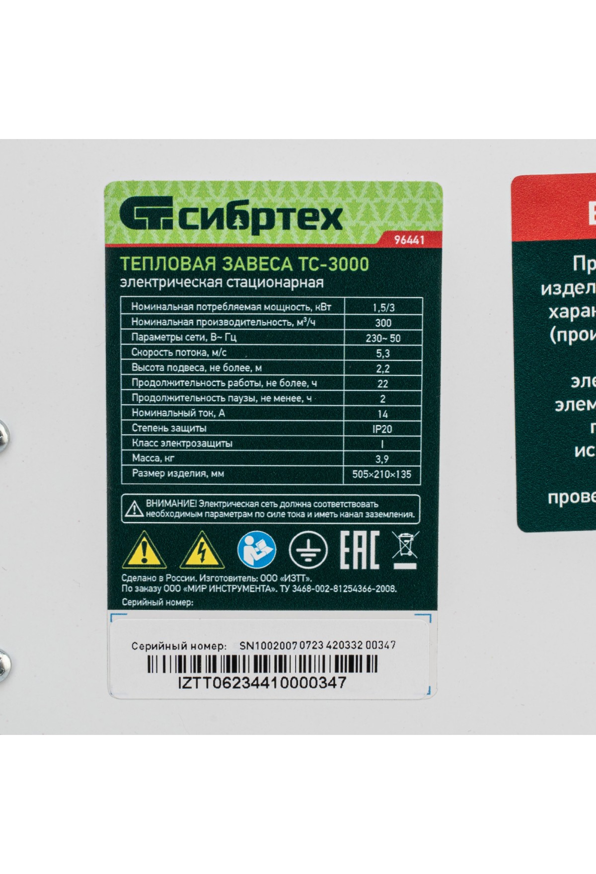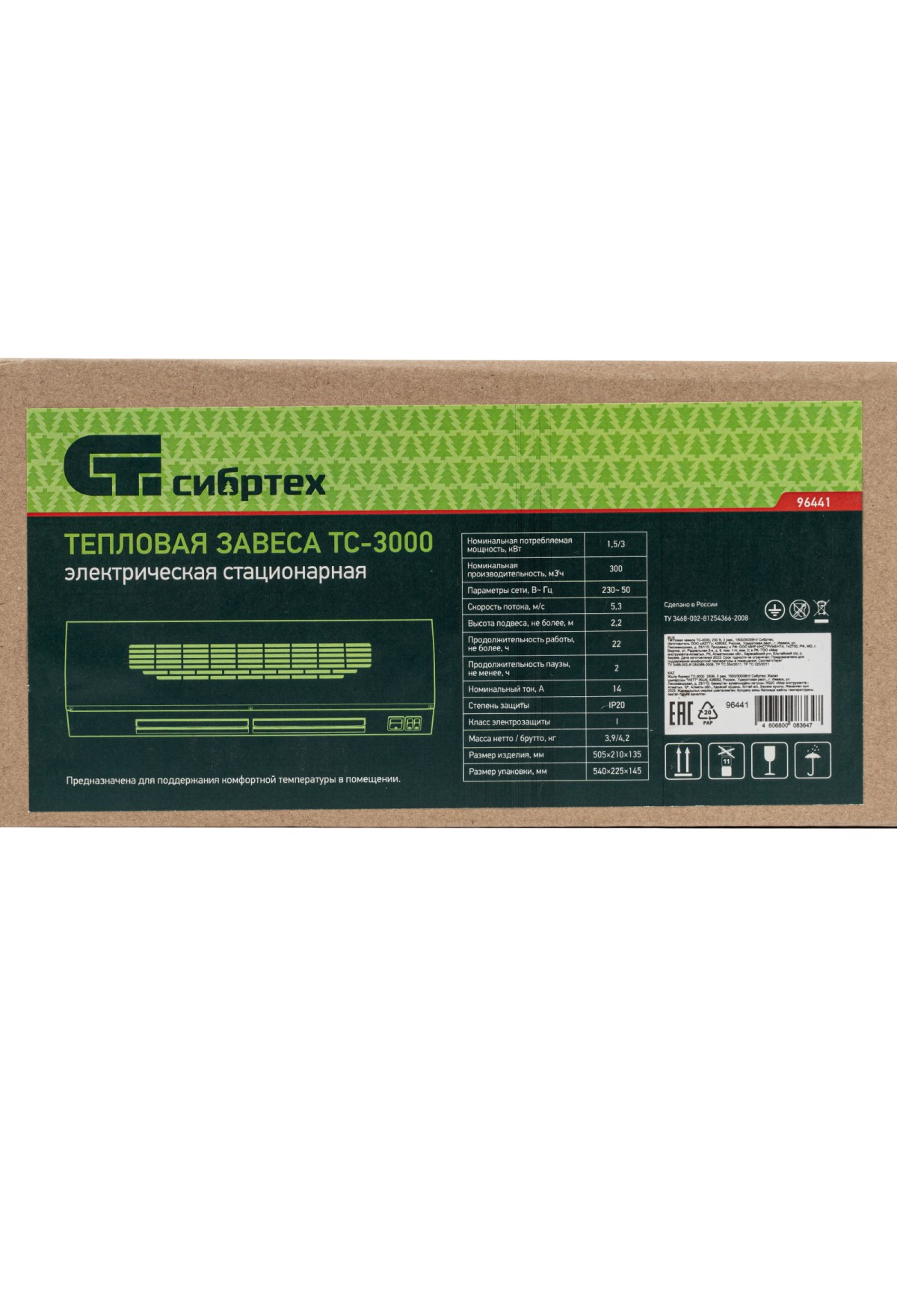 Электрическая тепловая завеса (тепловентилятор) Сибртех ТС-3000 96441 работает в 2 режимах: на мощности 1500 и 3000 Вт. Создает узконаправленный воздушный поток, позволяющий разделить различные климатические зоны, например, отделить воздух в помещении от воздуха снаружи. Устанавливается над оконными или дверными проемами, расход воздуха составляет 300 м3/ч. Питается от сети 220 В, поэтому подходит для домашнего применения. Игольчатый нагревательный элемент (ститч) обеспечивает быстрый разогрев до заданной температуры. Рекомендуемая площадь обогрева составляет 30 м2.