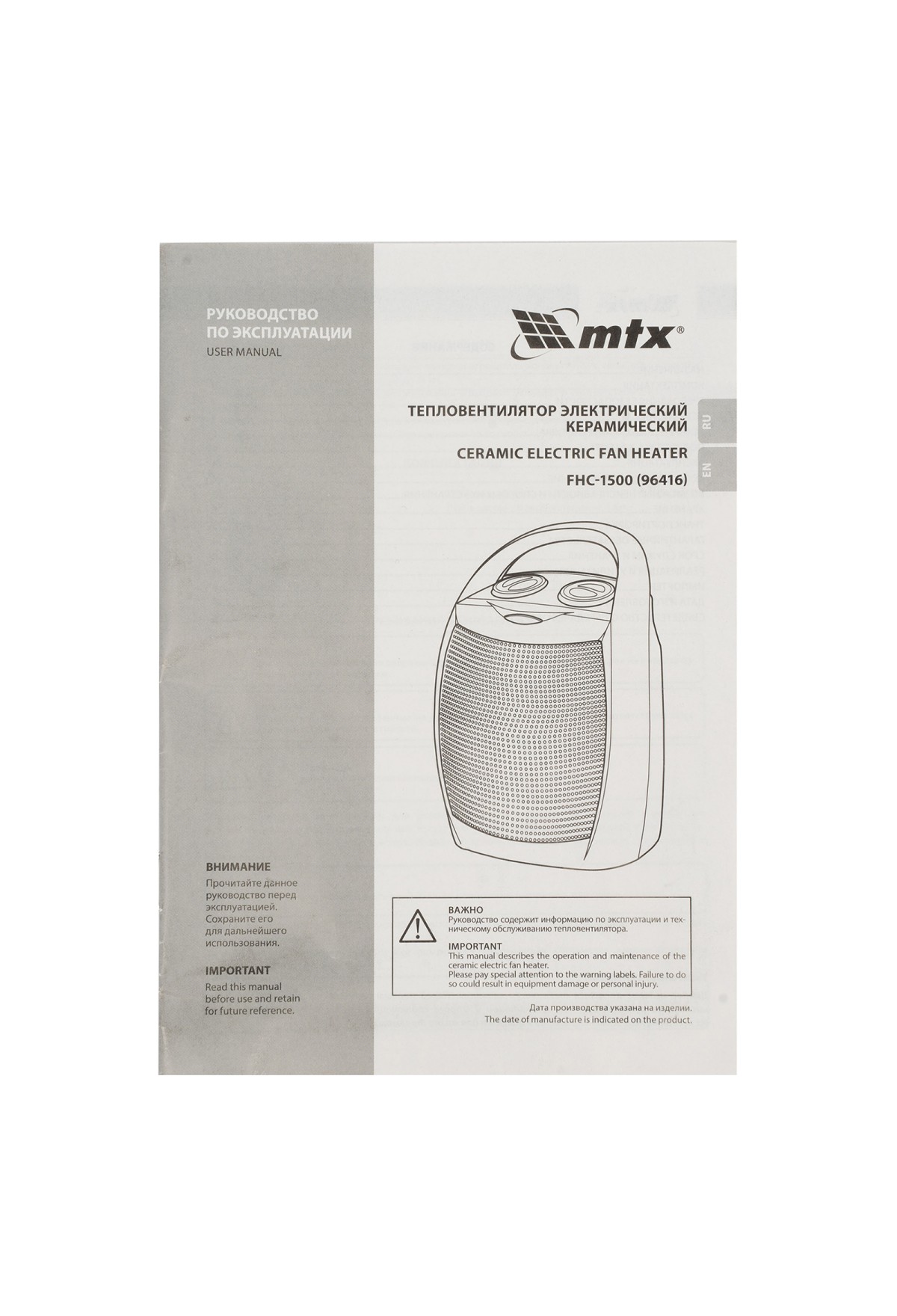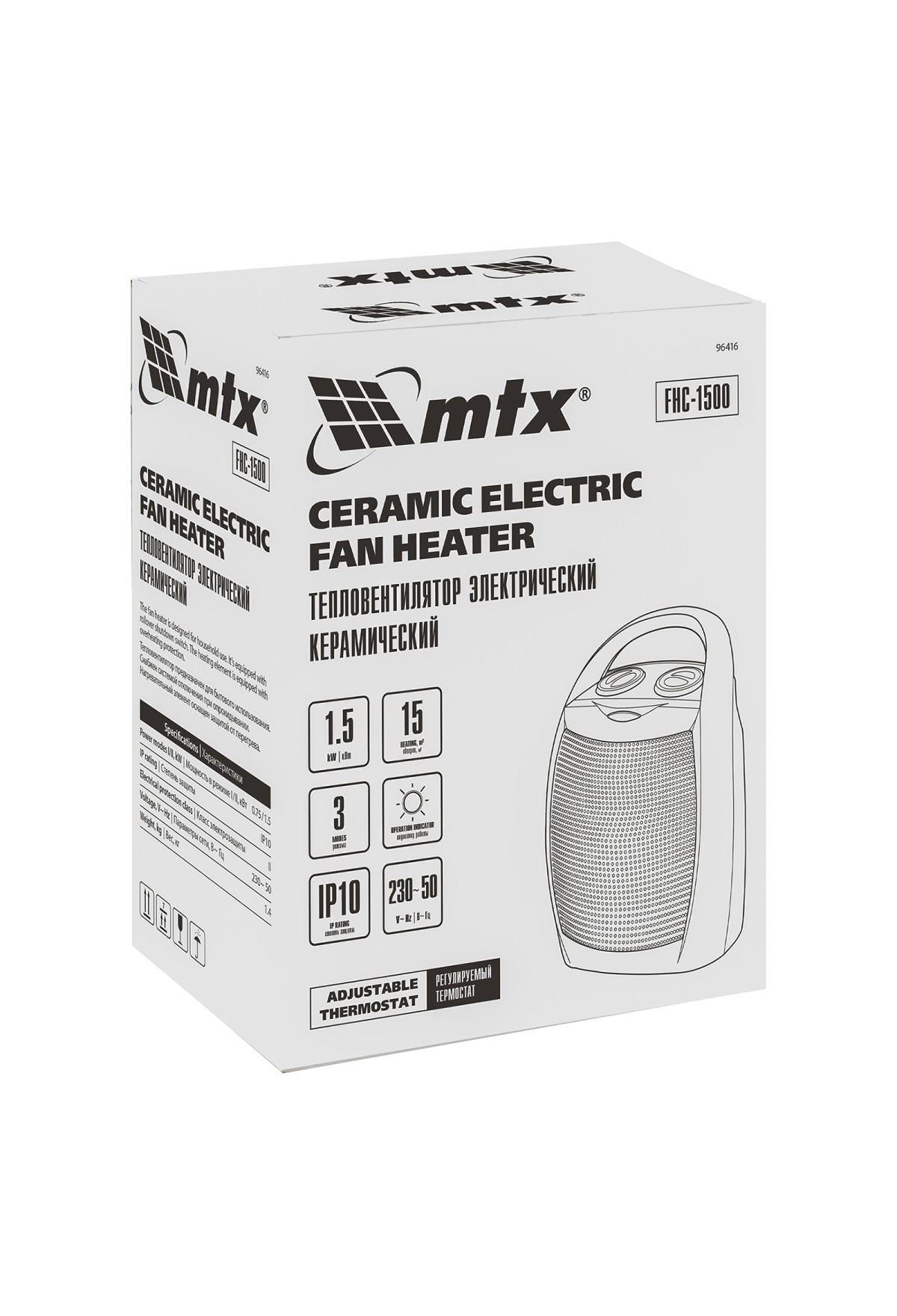 Тепловентилятор MTX FHC-1500 96416 работает в одном из трех режимов работы: вентиляция без нагрева, нагрев на мощности 750 Вт и 1500 Вт. Используется для обогрева комнат площадью до 20 кв. м на даче или в квартире. Тепловентилятор поддерживает необходимую температуру в холодную погоду и обеспечивает вентиляцию помещения в жару. Благодаря керамическому нагревательному элементу устройство не сжигает пыль, не выделяет вредных веществ и не сушит воздух, а также отличается повышенной пожаробезопасностью.