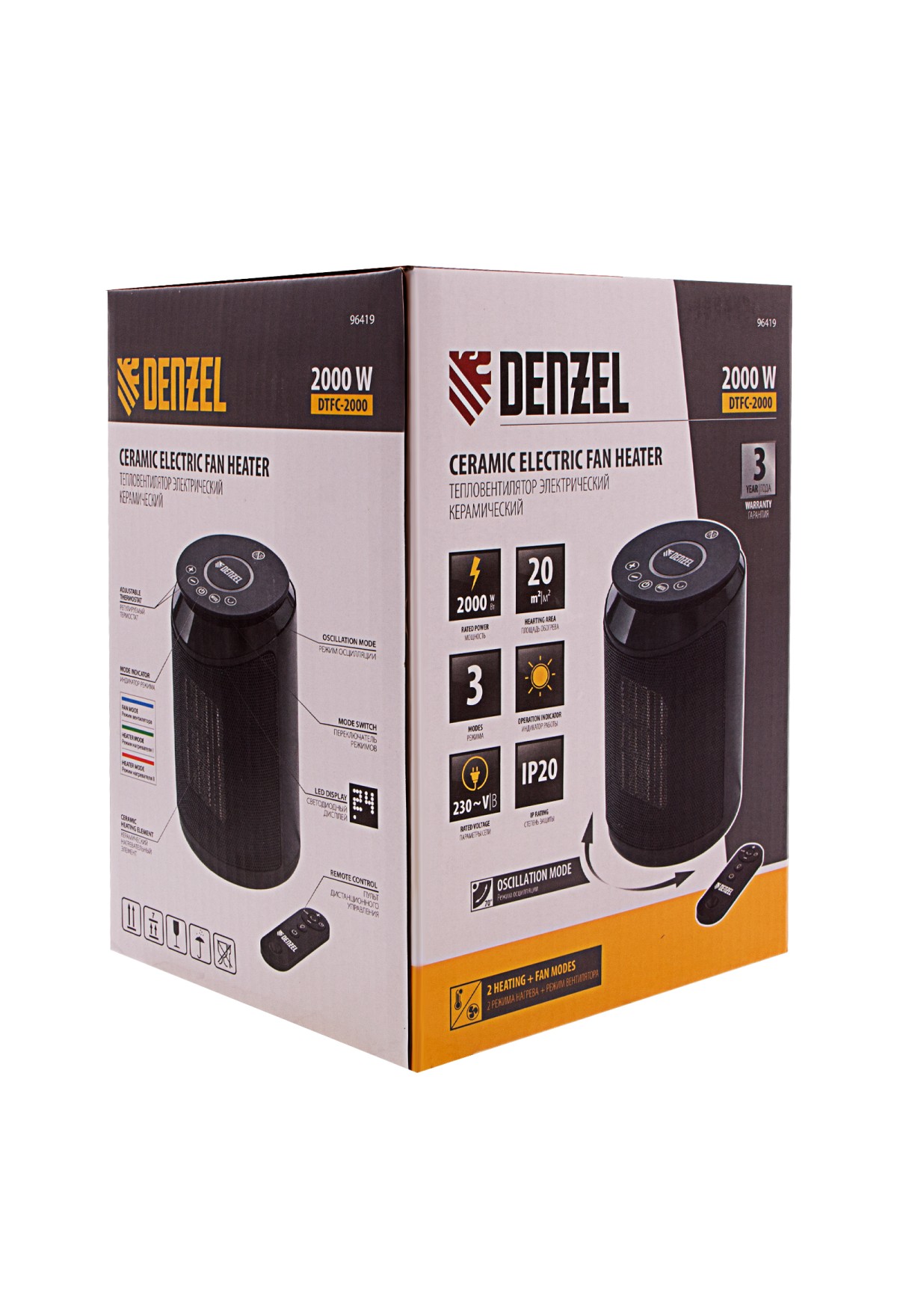 Электрический тепловентилятор Denzel DTFC-2000, 96419 с керамическим нагревательным элементом предназначен для обогрева и вентилирования бытовых помещений площадью до 20 м2. Он позволяет поддерживать комфортный климатический режим как в холодное, так и в теплое время года. Удобный и компактный тепловентилятор способен работать в 3 режимах: вентиляция, обогрев теплым и горячим воздухом. С помощью цифрового терморегулятора можно настроить необходимую температуру.