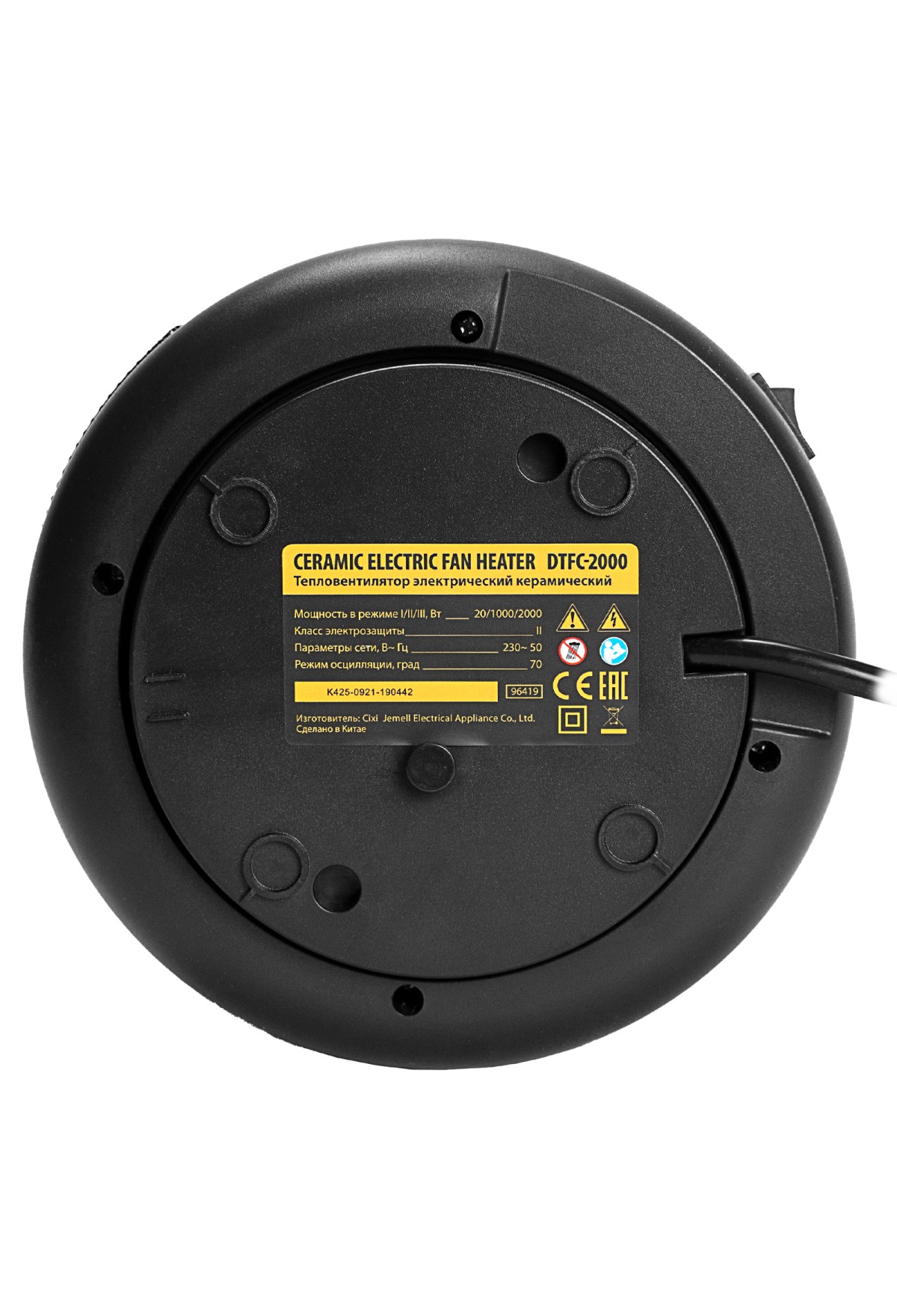 - Защита при опрокидывании — в нижней части корпуса находится специальная кнопка, которая срабатывает при падении и выключает тепловентилятор.