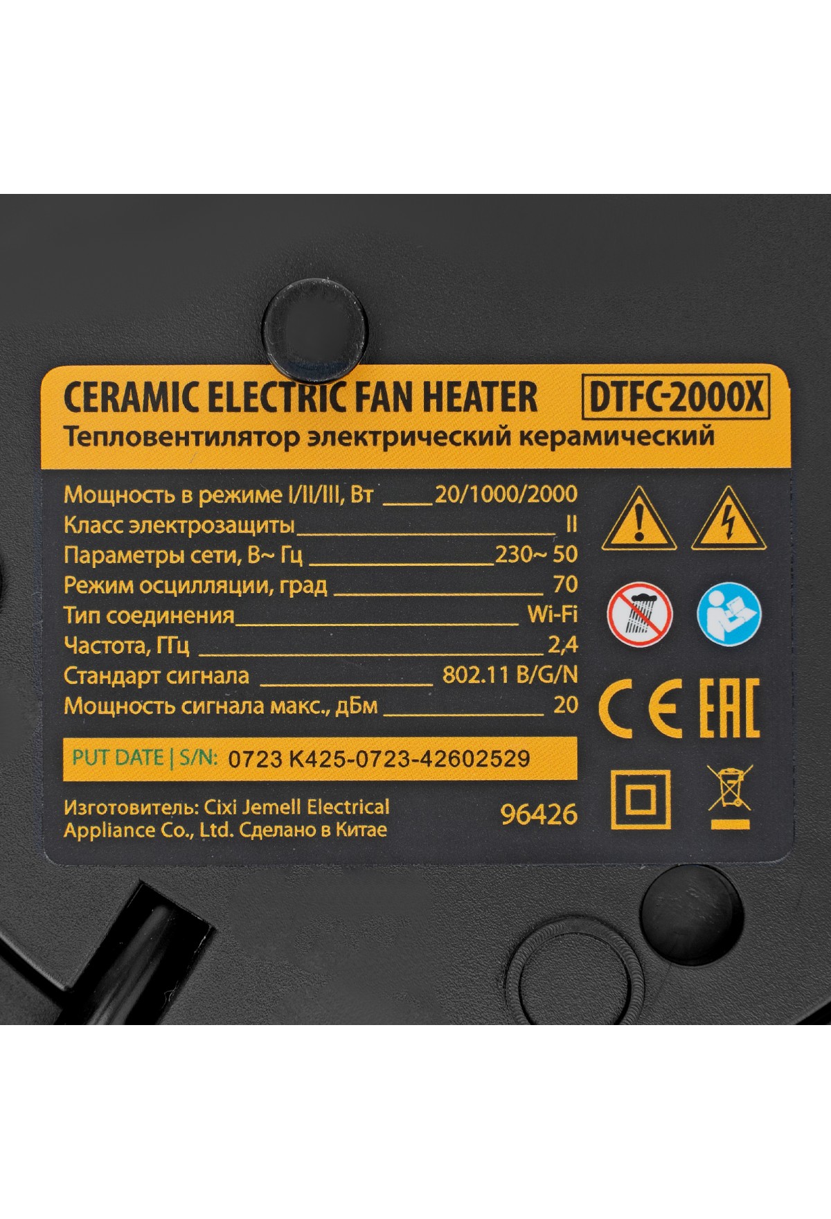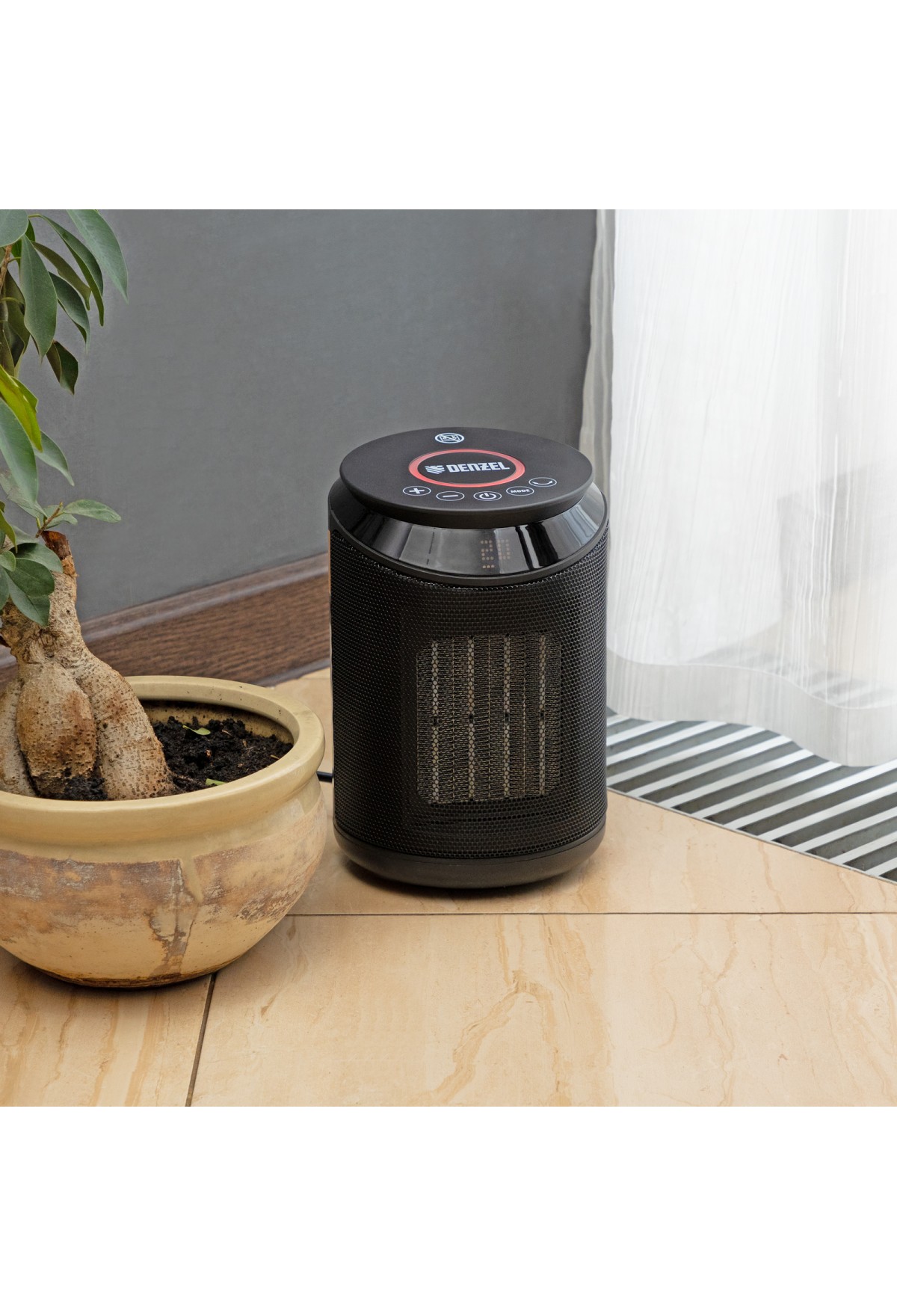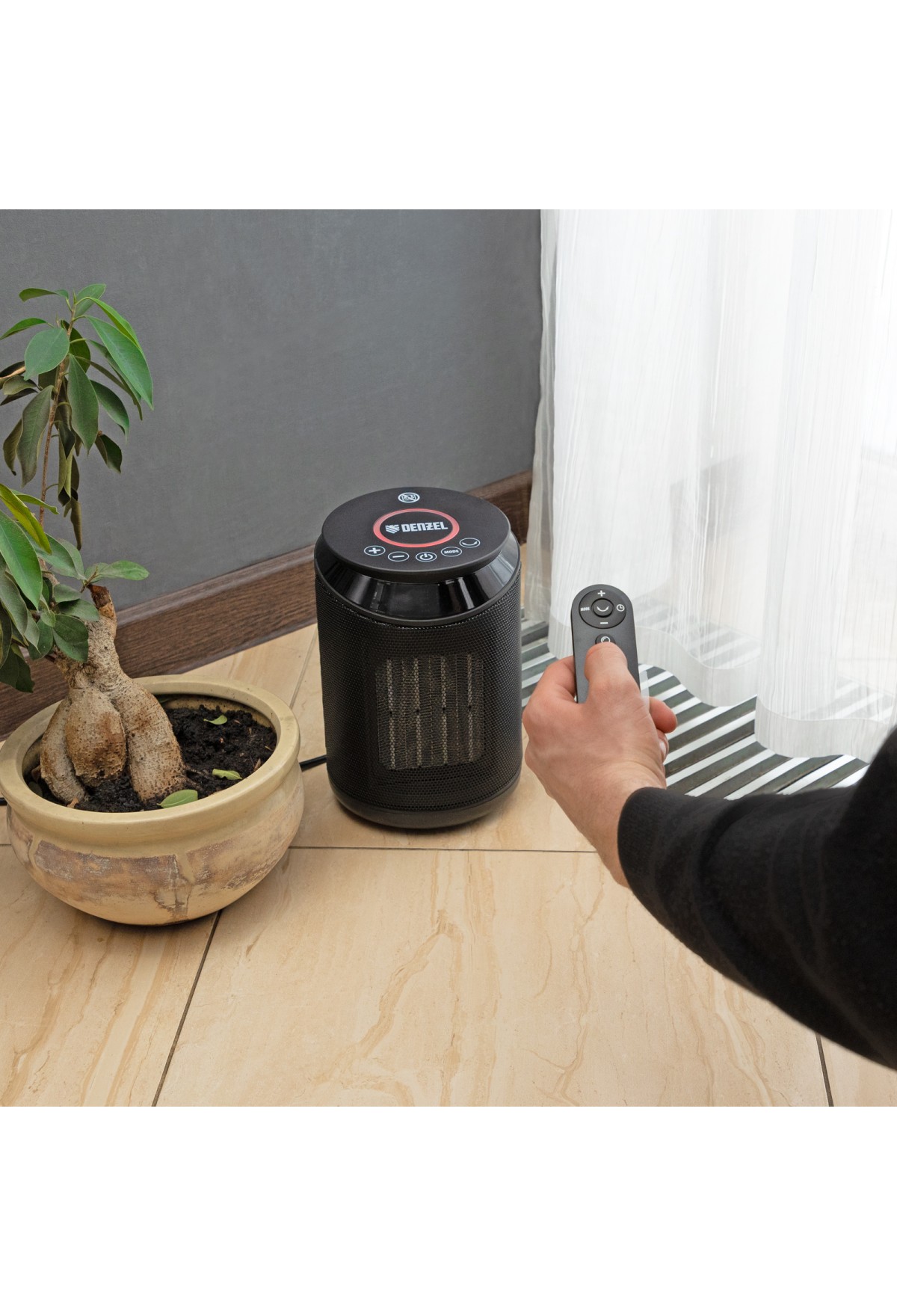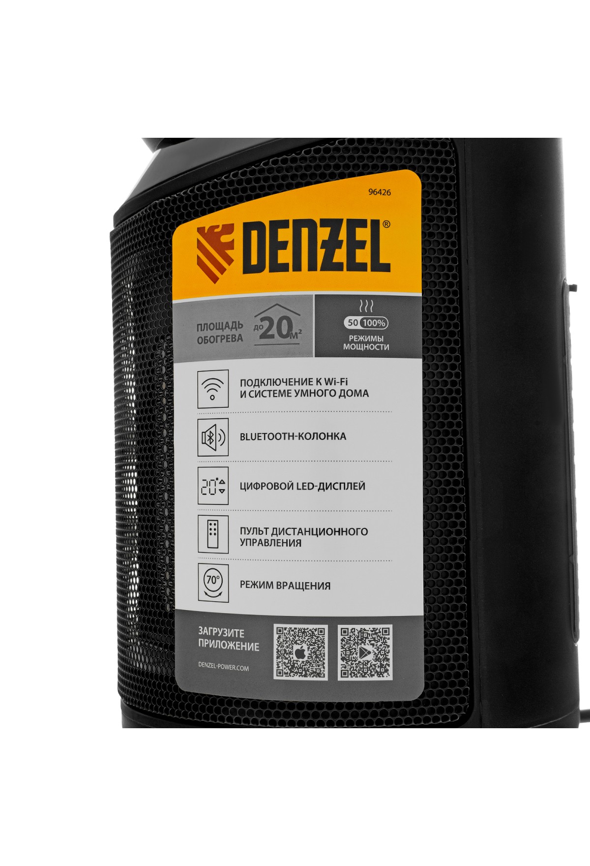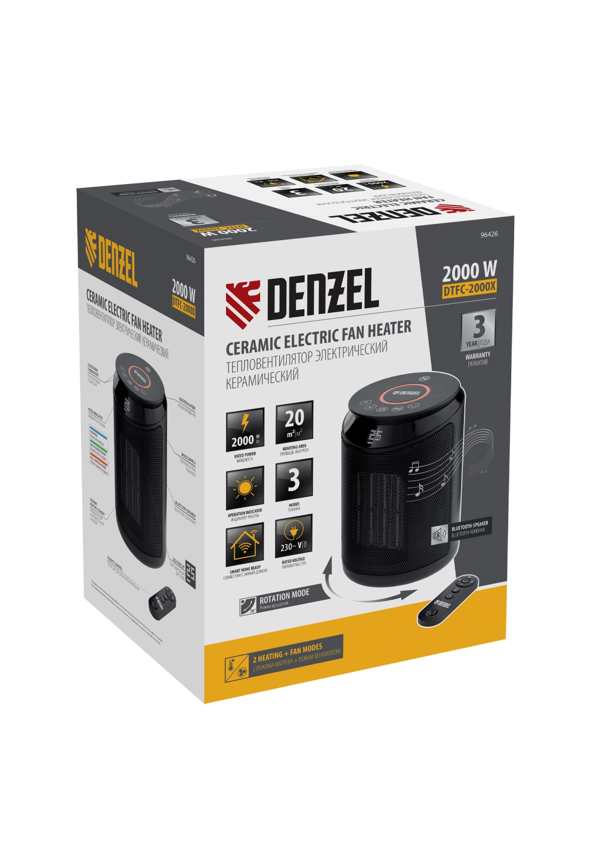 Тепловентилятор Denzel DTFC-2000X 96426 мощностью 2 кВт, с керамическим нагревательным элементом, пультом и динамиком, с функцией вращения и возможностью подключения по Wi-Fi, имеет 3 режима работы. Предназначен для обогрева и вентилирования бытовых помещений площадью до 20 м2. Позволяет поддерживать комфортный климатический режим в любое время года. Способен работать в режиме вентиляции, обогрева теплым (1000 Вт) и горячим воздухом (2000 Вт). В комплект поставки входит пульт дистанционного управления. Также можно подключить тепловентилятор к сети Интернет и управлять им из любой точки мира при помощи телефона или планшета с установленным приложением.