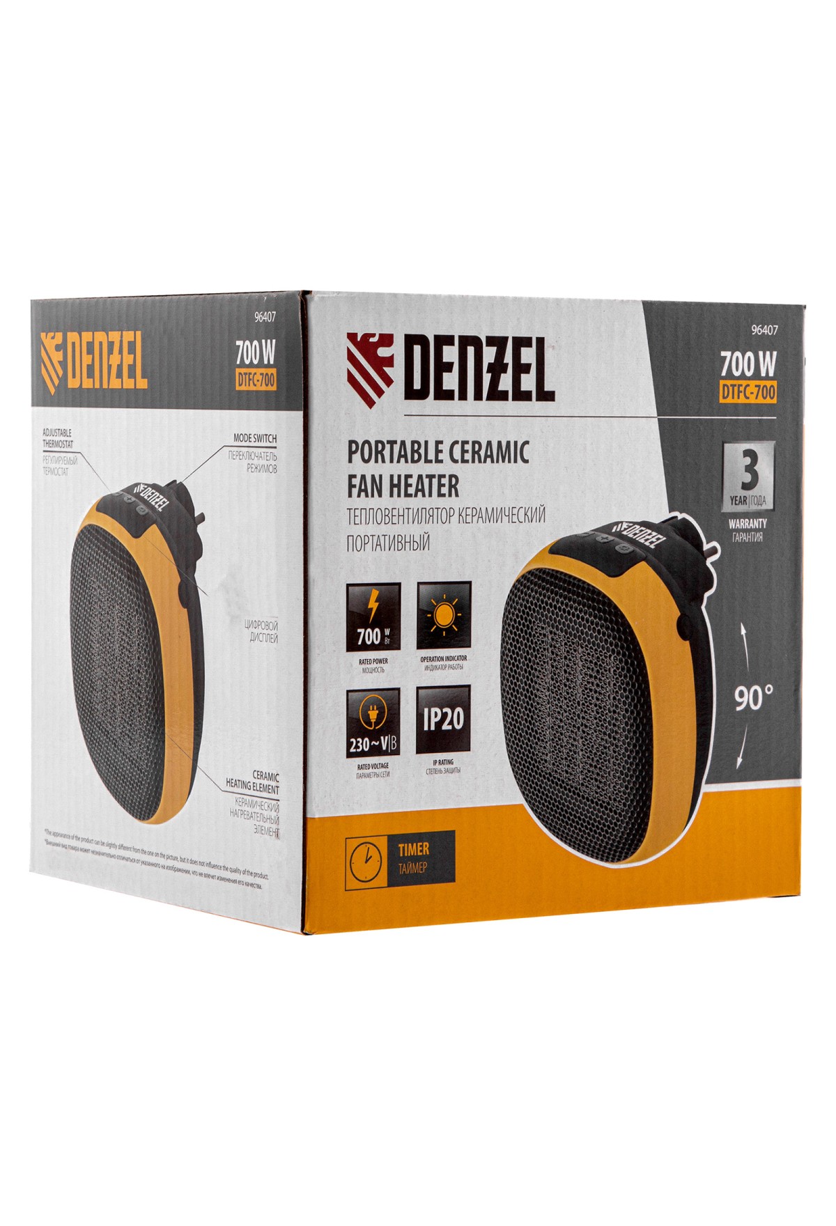 Портативный керамический тепловентилятор Denzel DTFC-700 96407 номинальной мощностью 700 Вт может работать в одном из двух режимов: нагрев с максимальной либо пониженной скоростью вентилятора (тихий режим). Используется в помещениях площадью до 10 кв. м., а также подходит для локального обогрева — например, рабочего места. Прост в эксплуатации и не требует технического обслуживания. Благодаря керамическому нагревательному элементу тепловентилятор не сушит воздух и не сжигает пыль, поэтому комфортен в использовании.