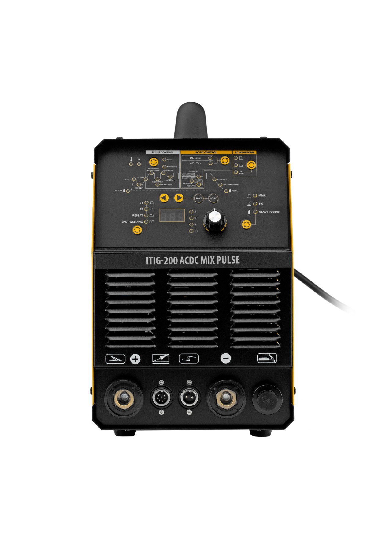 Основные функции,Выбор режима TIG-сварки: ,Repeat — быстрое возобновление сварки без начального этапа циклограммы. ,Spot Welding — сварка в течение коротких отрезков времени от 0,1 до 10 секунд, удобная для сварки тонких и чувствительных к нагреву материалов.,Pulse — позволяет лучше контролировать тепловложение, чтобы избежать перегрева и проплавления свариваемых деталей.,Режим MIXTIG для сварки на переменном токе АС — чередование фаз переменного и постоянного тока. В фазе переменного тока происходит разрушение оксидной пленки на поверхности заготовки, фаза постоянного тока обеспечивает глубокое проплавление детали.,Возможность настройки формы волны переменного тока в зависимости от конкретной задачи:,Прямоугольная волна — обеспечивает глубокое проплавление, быстрые скорости прохода и стабильную сварочную дугу.,Синусоидальная волна — классическая форма волны. Дуга мягкая, обладает эффектом широкого, но в то же время неглубокого расплавления основного металла.,Треугольная волна — обеспечивает эффективность пиковой токовой нагрузки при уменьшении общего подвода тепла, а также быстрое образование сварочной ванны. Ограничивает подводимую теплоту и уменьшает степень деформации сварочного шва. Хорошо подходит для сварки тонкого алюминия, также обеспечивает лучшую очистку при анодном окислении.,Гибкая настройка всех параметров автоматизированного цикла сварки в широком диапазоне значений: