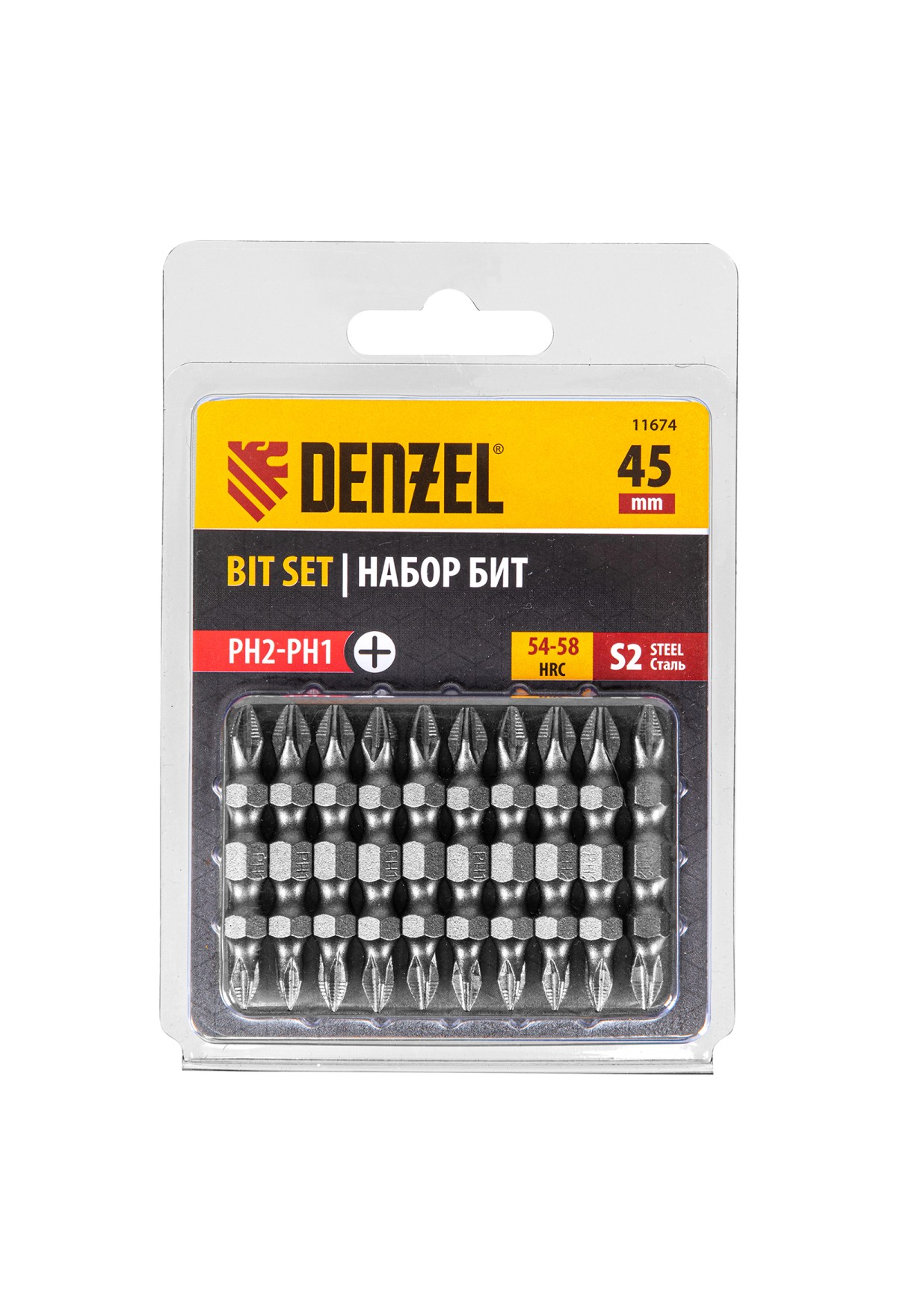 Технические характеристики Бита двухсторонняя, PH2-PH1 х 45 мм, сталь S2, 10 шт. Denzel