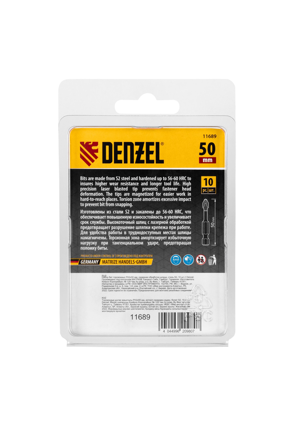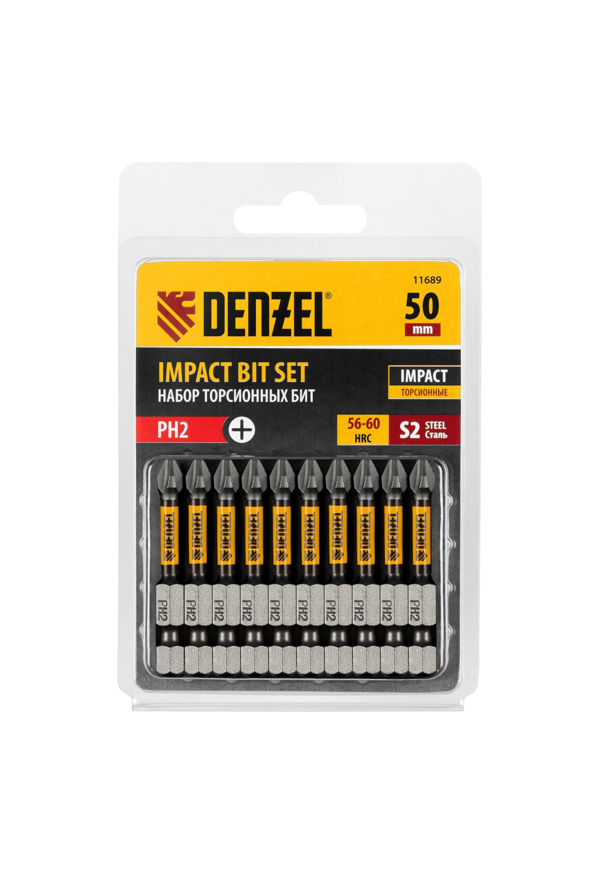Набор бит торсионных PH2 x 50 мм Denzel 11689 с лазерной обработкой шлица, из стали S2, 10 шт., предназначен для монтажа и демонтажа резьбовых соединений с помощью ударного шуруповерта. Он незаменим в строительных, слесарных и монтажных работах, в автосервисах, при проведении ремонта в доме.,Торсионная зона способна пружинить, за счет чего она частично амортизирует тангенциальный удар от шуруповерта. Такое решение позволяет равномерно распределить нагрузку по бите, избежать поломки шлица и в разы увеличить объем работы, проделанный одной насадкой.