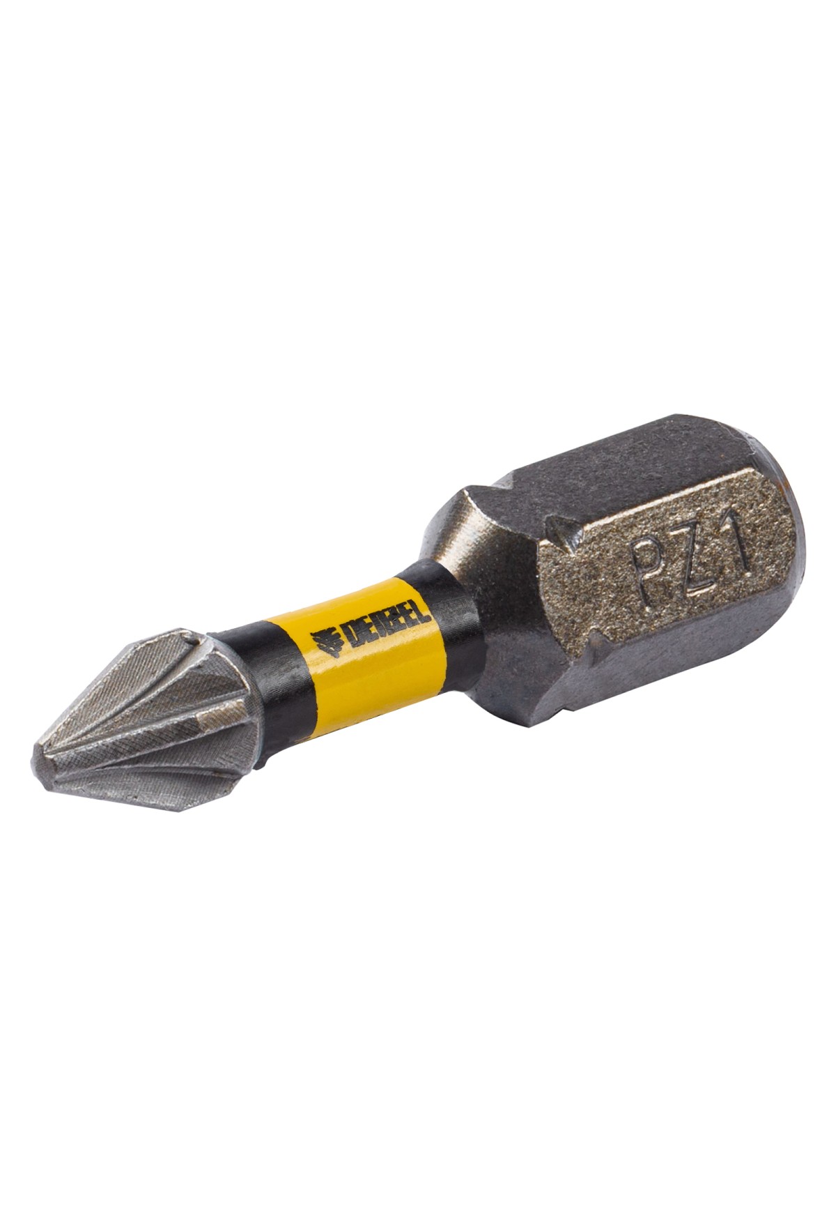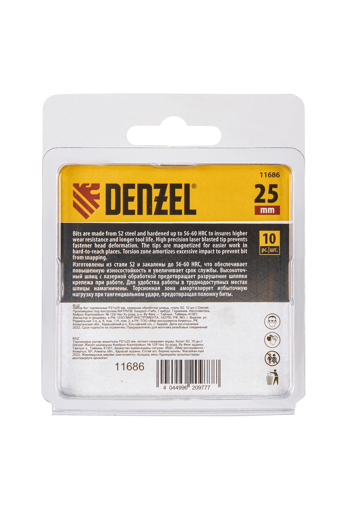 Набор бит торсионных PZ1 x 25 мм Denzel 11686 с лазерной обработкой шлица, из стали S2, 10 шт., предназначен для монтажа и демонтажа резьбовых соединений с помощью ударного шуруповерта. Он незаменим в строительных, слесарных и монтажных работах, в автосервисах, при проведении ремонта в доме.,Торсионная зона способна пружинить, за счет чего она частично амортизирует тангенциальный удар от шуруповерта. Такое решение позволяет равномерно распределить нагрузку по бите, избежать поломки шлица и в разы увеличить объем работы, проделанный одной насадкой.