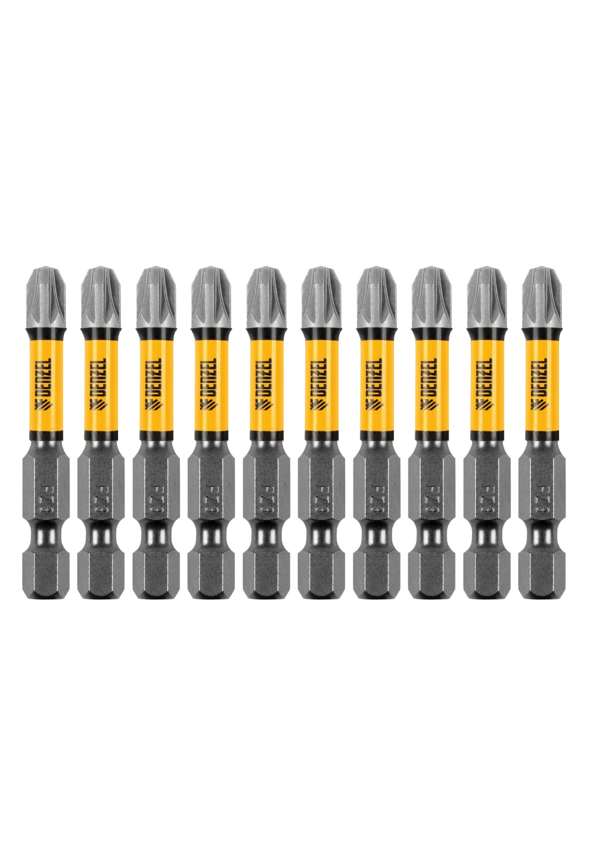 Набор бит торсионных PZ3 x 50 мм Denzel 11693 с лазерной обработкой шлица, из стали S2, 10 шт., предназначен для монтажа и демонтажа резьбовых соединений с помощью ударного шуруповерта. Он незаменим в строительных, слесарных и монтажных работах, в автосервисах, при проведении ремонта в доме.,Торсионная зона способна пружинить, за счет чего она частично амортизирует тангенциальный удар от шуруповерта. Такое решение позволяет равномерно распределить нагрузку по бите, избежать поломки шлица и в разы увеличить объем работы, проделанный одной насадкой.