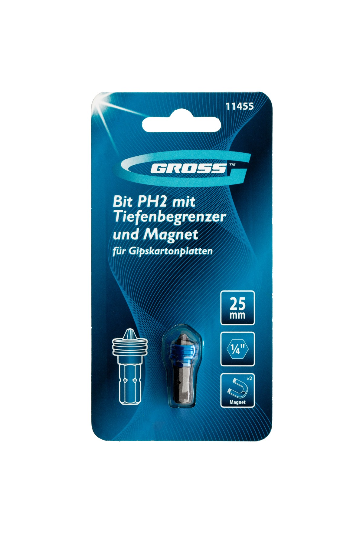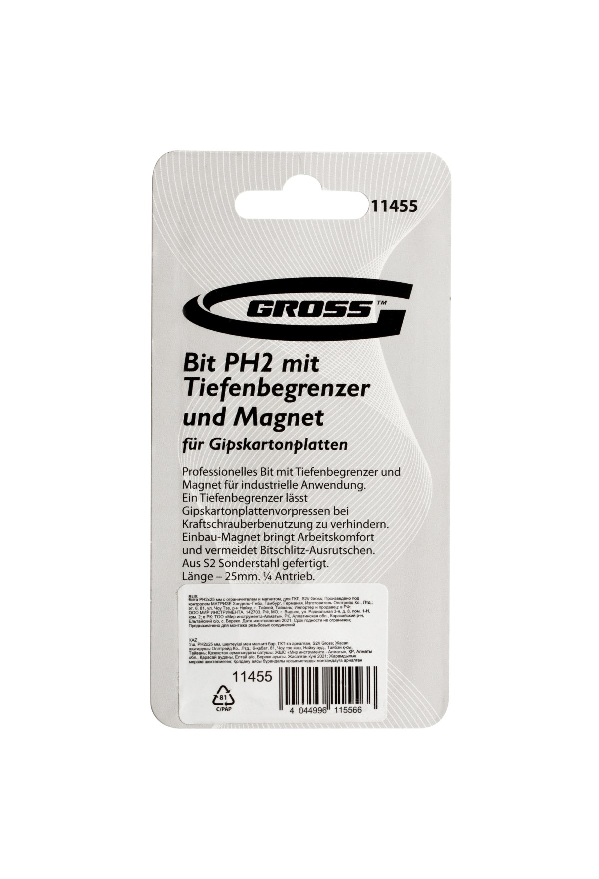 Бита Gross 11455 типоразмера PH2 x 25 мм, из стали S2, c ограничителем и магнитом, оптимально подходит для монтажа и демонтажа саморезов в гипсокартонные листы. Используется в качестве оснастки для шуруповертов и отверток. Благодаря встроенному ограничителю хода крепеж ввинчивается на необходимую глубину, что позволяет избежать повреждения материалов и экономит время мастера.