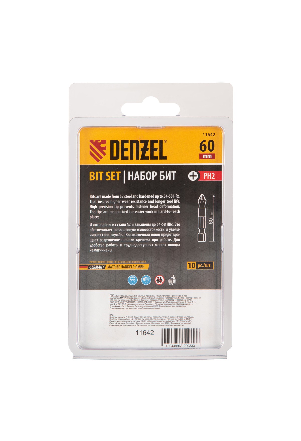 Технические характеристики Бита PH2х60, сталь S2, цилиндр., 10 шт. Е 6,3 Denzel