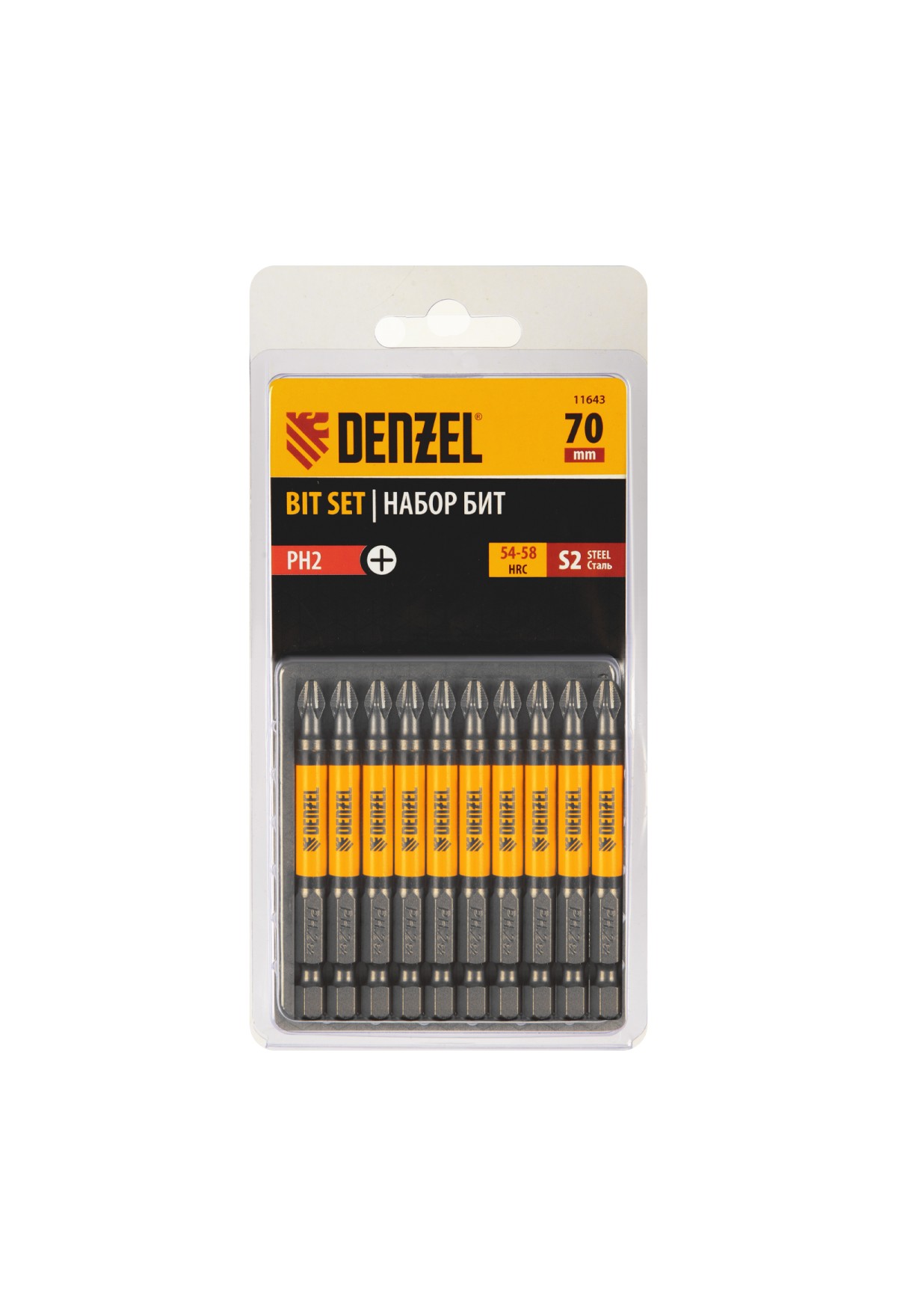 Технические характеристики Бита PH2х70, сталь S2, цилиндр., 10 шт. Е 6,3 Denzel