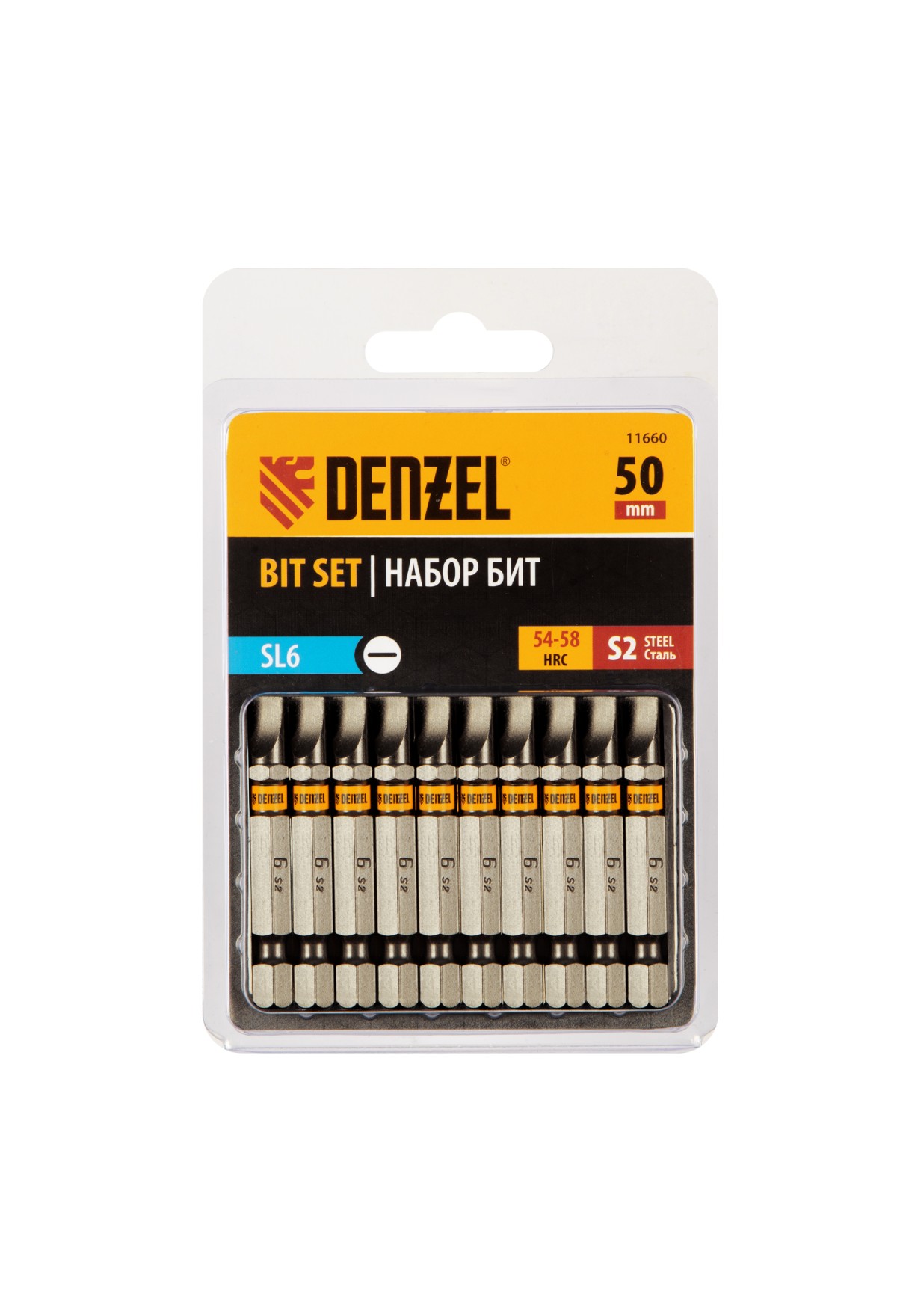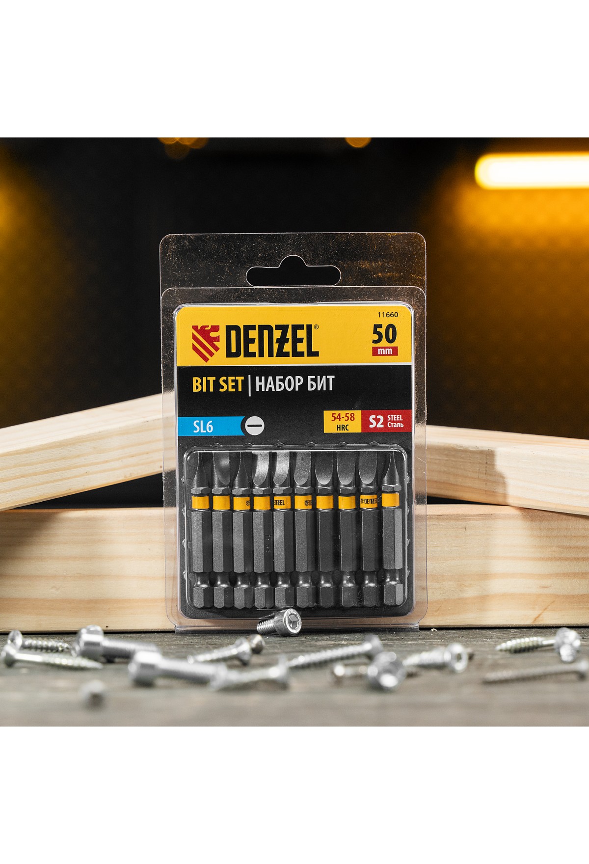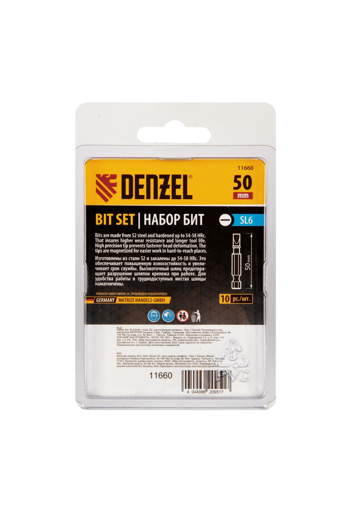 Технические характеристики Бита SL6,0х50, сталь S2, шестигранный профиль, 10 шт. Е 6,3 Denzel
