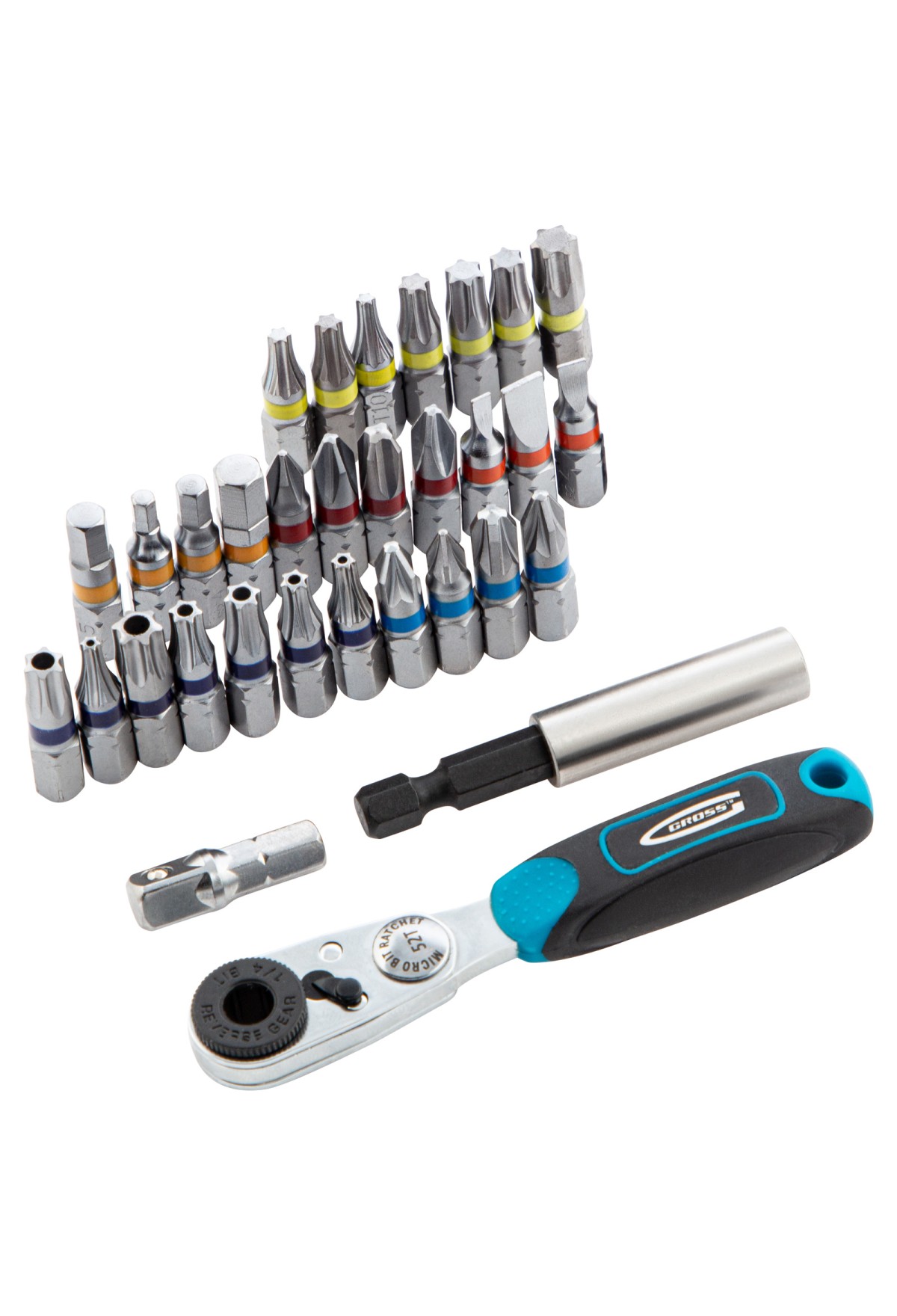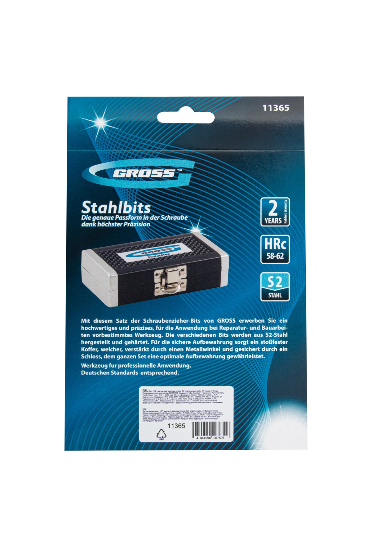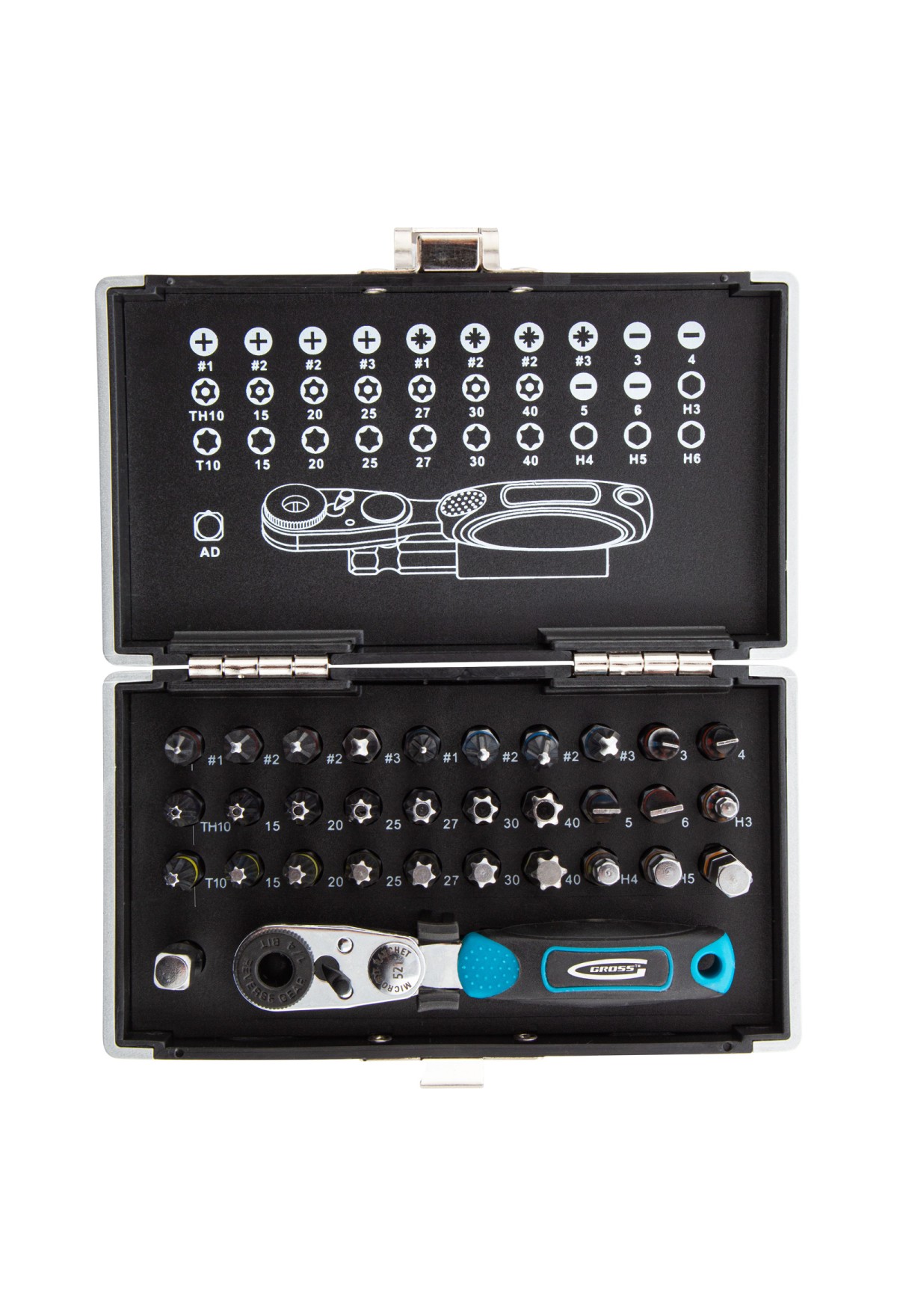 Технические характеристики Набор бит, 1/4, магнитный адаптер, сталь S2, пластиковый кейс, 33 предмета Gross